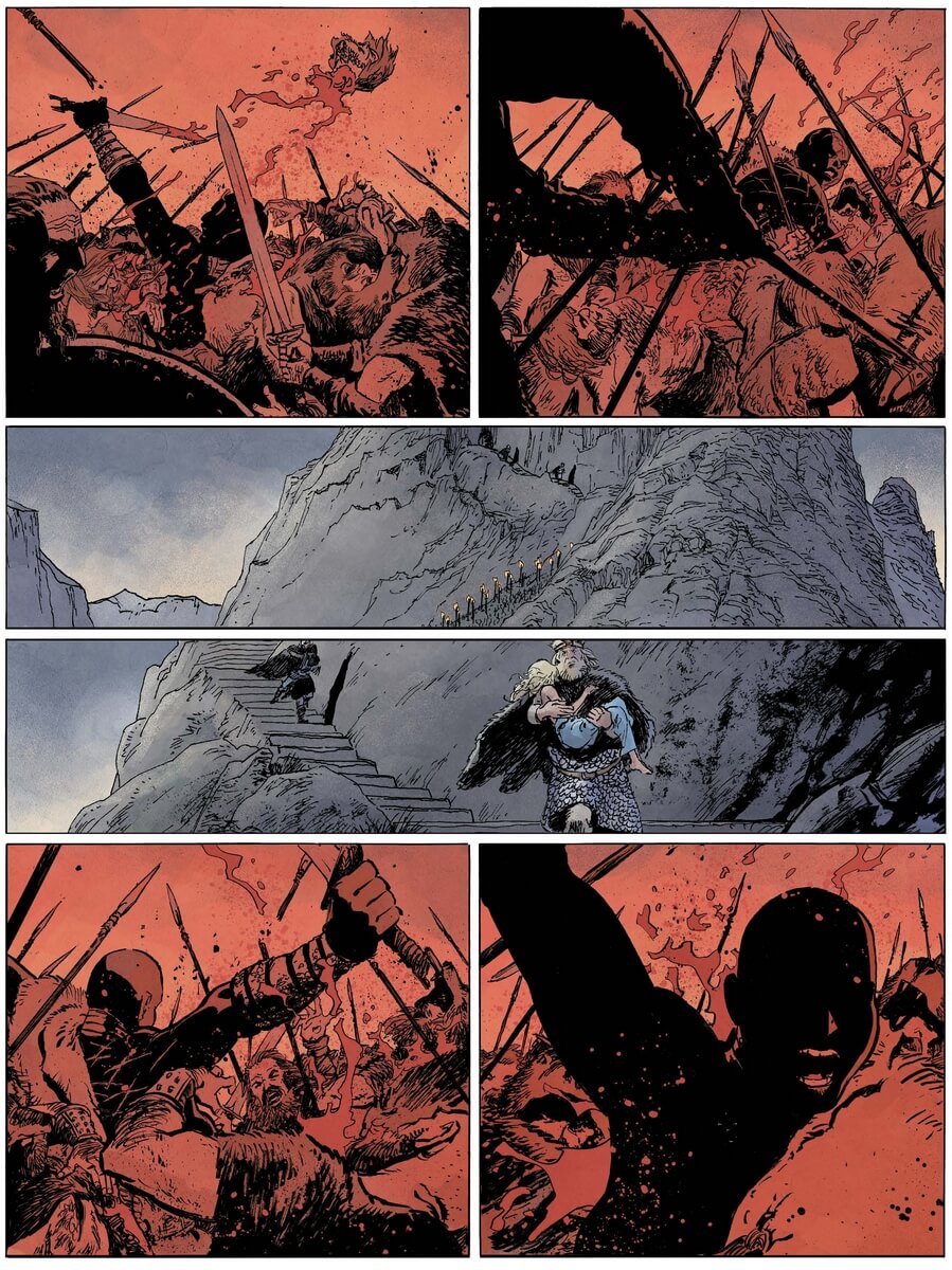 Ce que réalise Robin Recht dans ce nouvel album de Thorgal est une véritable prouesse à tous les niveaux ! À commencer par la partie graphique où le dessinateur d’Elric démontre, s’il en était besoin, une fois de plus sa maitrise à réaliser des récits d’héroic fantasy. Dans Adieu Aaricia, son identité graphique se mêle brillamment à l’univers créé par Jean Van Hamme et Grzegorz Rosinski. Tout en respectant l’habileté qu’avait Rosinski à donner beaucoup d’expressions à ses personnages, à faire ressentir les ambiances hostiles ou plus contemplatives, Robin Recht joue une partition similaire en apportant son trait qui nous avait déjà tant plu dans le tome 4 de Conan le Cimmérien. On ne peut passer à côté de certaines cases où se dégagent de belles émotions bonifiées par la colorisation raffinée de Gaétan Georges, habitué de la série.