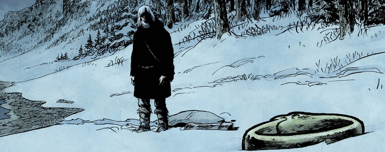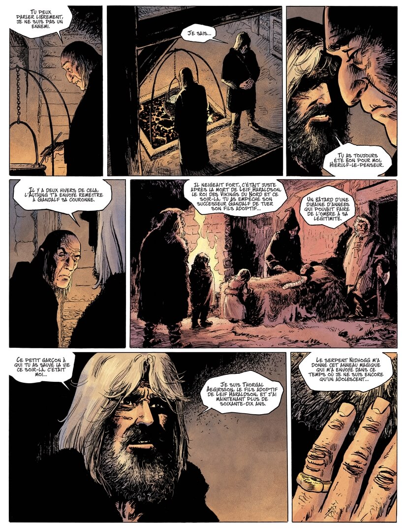 À peine eut-il enfilé l’anneau à son doigt que Thorgal se retrouva près de son village d’antan, celui des Vikings du Nord. Sur la plage, il rencontre un premier jeune visage familier, Solveig est la meilleure amie d’Aaricia. Blessée et inconsciente, il connait le chemin pour la ramener auprès de sa mère. En arrivant sur les lieux, Thorgal reconnait le peuple avec qui il vivait autrefois. Les retrouvailles avec Gandalf-le-Fou sont aussi tendues que la relation qui animait le roi et l’enfant des étoiles.