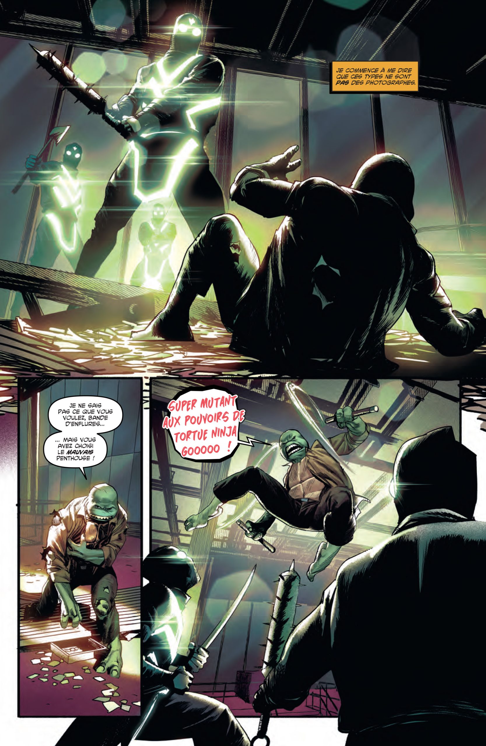 Pourquoi le clan Foot attaque-t-il les Tortues à ce moment précis ? L’histoire ne le révèle pas encore. Ce n’est pas le moment. Il faudra bien que le scénariste explique pourquoi Karai est passée à l’action alors que les Tortues étaient inoffensives, mais là n’est pas le sujet. Jason Aaron veut reforger la relation entre les quatre frères et c’est tout ce qui compte à ce stade. Les Foot sont là pour en prendre plein les dents et soutenir l’apparition d’un nouvel antagoniste humain mais néanmoins roublard et cruel.