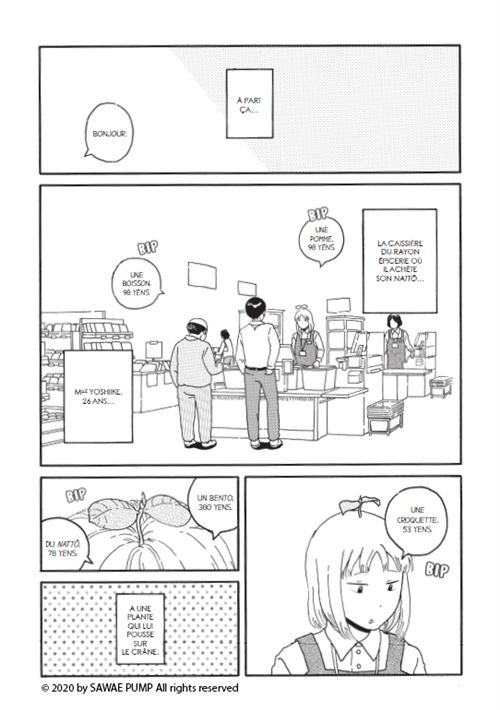 Résumé de l’éditeur : Une épouse qui vit enfermée nue chez elle, une gamine survoltée qui remonte le temps pour secouer les puces à l’ado déprimé qui lui sert d’aïeul, un catcheur qui ne se bat jamais sans ses lunettes, des plantes qui aiment se mêler aux humains, des grands-pères qui volent sans effort dans le ciel, des choses bizarres sur lesquels on tombe parfois la nuit, dans le noir… Virtuose de la tranche de vie, Pump Sawae sublime les mille et une petites choses qui surviennent tout au bout du quartier. Une nouvelle fois, l’auteur de Panda Detective Agency sait surprendre et émerveiller.