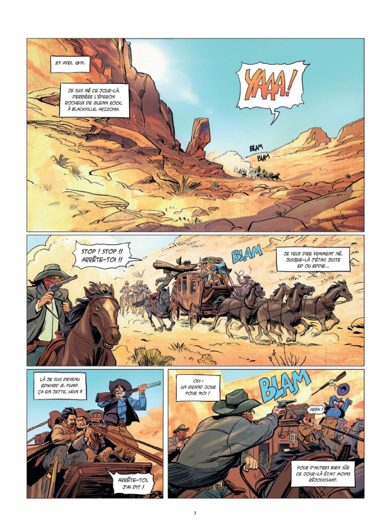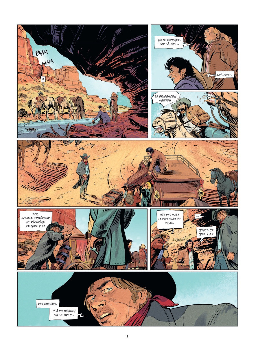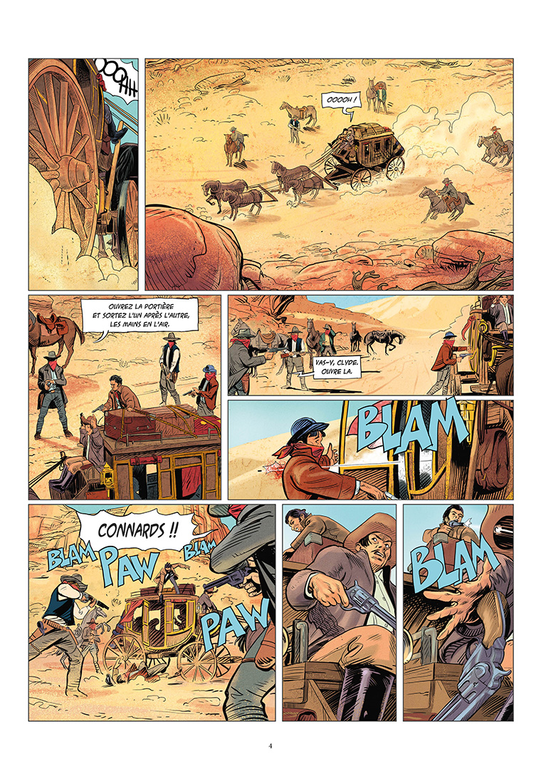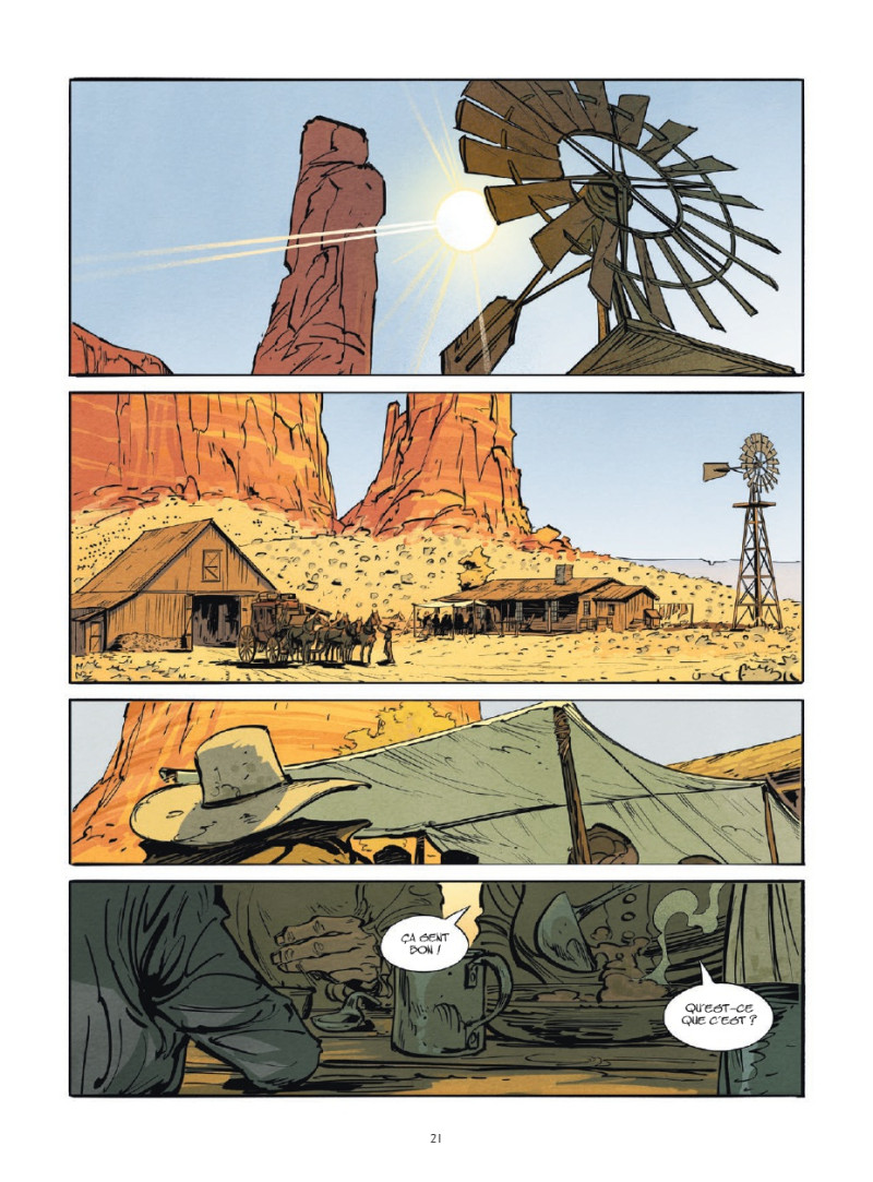 Et puis, baignés de couleurs chaudes, de l’ocre aux jaunes dorés, les dessins de Chris Regnault sont magnifiques. Alternant pages denses de plusieurs cases avec d’autres plus larges, dignes d’un effet cinémascope, cette BD nous fait penser à un film de John Ford ou un western spaghetti à la Sergio Leone. On passe un excellent moment.