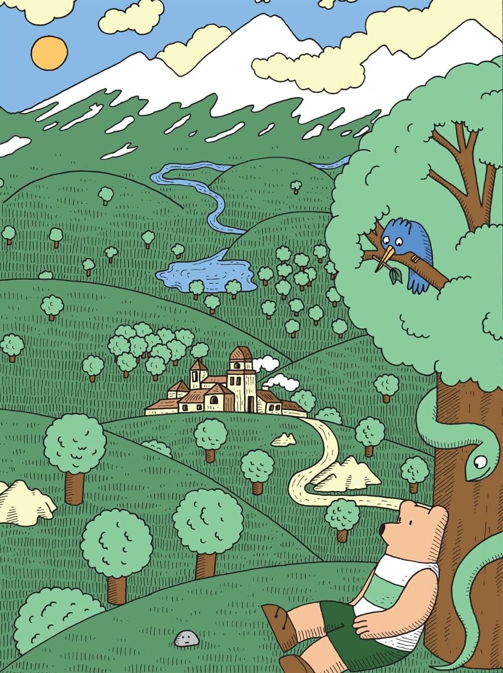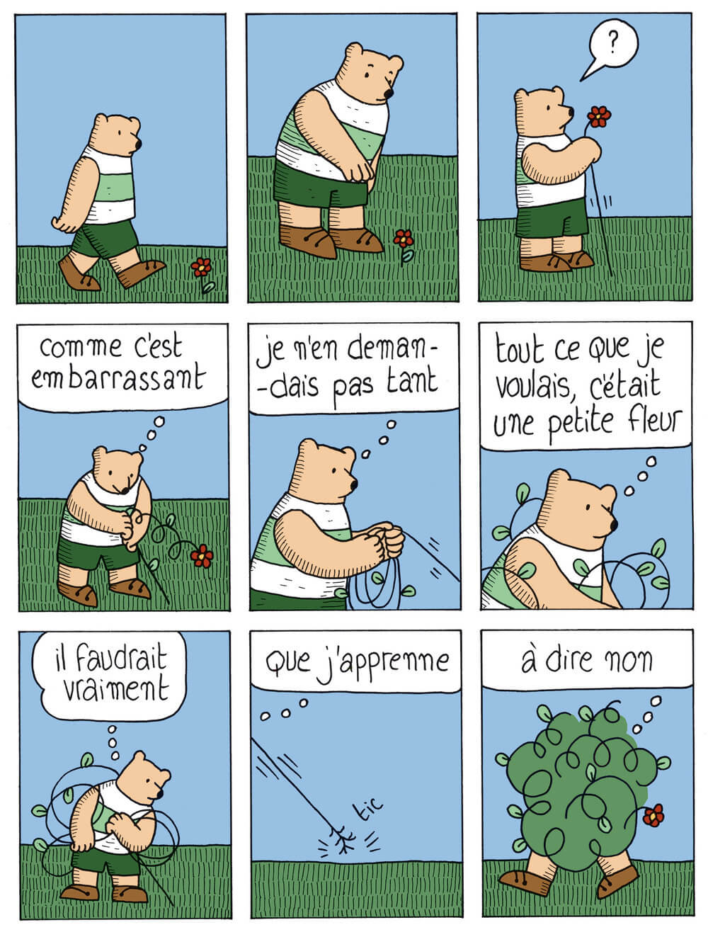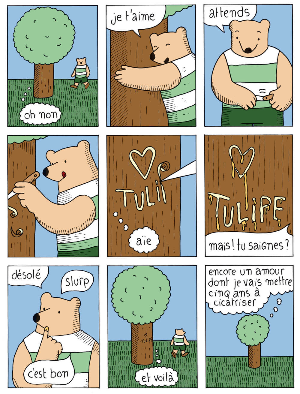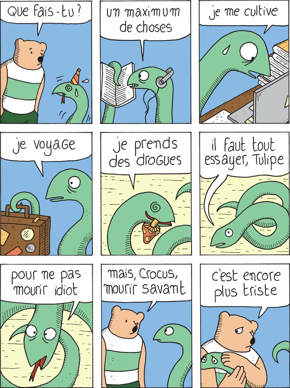 Résumé de l’éditeur : « Le loup et l’agneau partageront la même couche, mais l’agneau ne dormira pas beaucoup. » Woody Allen. L’Ours Tulipe, contre son arbre adossé, regarde s’agiter vainement ses compagnons : Crocus le Serpent combat son anxiété par une activité de tous les instants, l’oiseau Violette cherche un moyen d’entrer en contact avec le Soleil, son amoureux, et le Caillou désespère de n’être qu’un caillou. La vie ? Un sacré sac de petits tracas et de grandes contrariétés. Mais comme le dit si bien Crocus, avec des pauses crêpes, ça passe. Dans cette fable pleine de tendresse, les grandes questions existentielles prennent corps, poils, plumes ou écailles. Crocus l’hyperactif, Mimosa la taupe timide, Tulipe l’ours stoïcien, vivent des amours impossibles, aspirent à une existence enfin comblée. Dans la lignée des Peanuts ou de Mafalda, Sophie Guerrive invente des personnages attachants, symbolisant chacun une fragilité humaine. Tulipe est le reflet de nos névroses, de nos ridicules et de nos grandeurs, dépeints par des paroles sublimes et absurdes à la Nasr Eddine Hodja, où les figures du Savant, du Poète et de l’Idiot se confondent.
