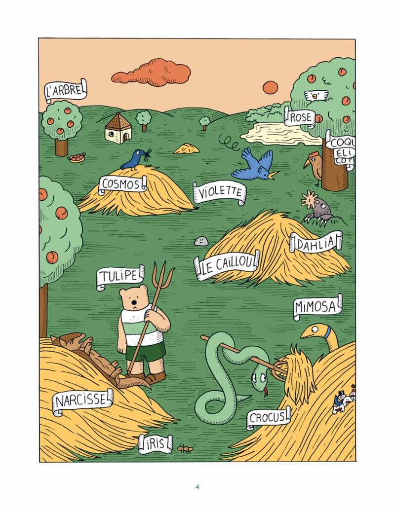 Dans un pays lointain vivent l’ours Tulipe qui passe son temps son temps à flâner sous son arbre, l’oiseau Violette amoureux du Soleil, Narcisse le tatou flemmard, Cosmos le corbeau, Dahlia la taupe timide, Iris la fourmi, le Caillou mais aussi Crocus et Mimosa les serpents amoureux.