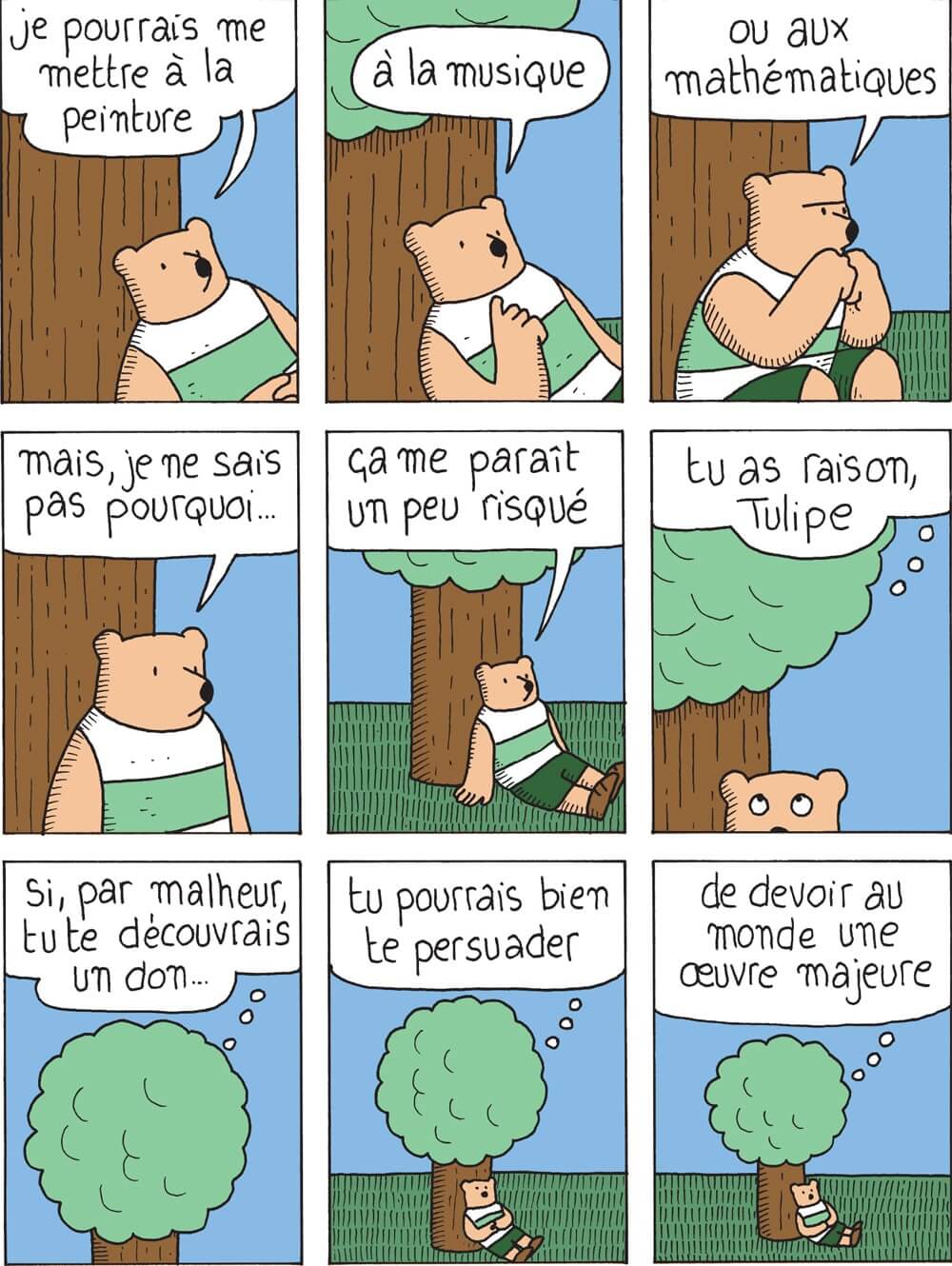 La poésie, l’onirisme et l’humour de Tulipe font aussi penser à L’ours Barnabé de Philippe Coudray (La boîte à bulles) mais aussi à Mafalda de Quino.