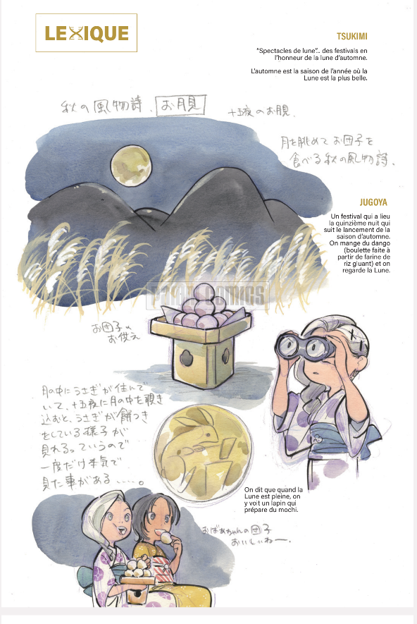 On notera également l’intelligence de l’édition française d’avoir intégré les pages « lexiques », dans lesquelles à chaque fin de chapitre, Peach Momoko nous donne des clés de lecture de son récit. Autant en nous détaillant des pans de sa culture japonaise qu’en nous donnant des anecdotes sur les personnages. On se retrouve donc avec douze pages supplémentaires, couvertes de quelques illustrations cadeaux de la dessinatrice Momoko. De la même manière, on apprécie les nombreuses couvertures alternatives, au nombre de seize dans cette édition, de l’autrice qui avait gagné, à juste titre, l’Eisner Awards pour la meilleure artiste de couvertures à deux reprises (en 2021 et 2024).