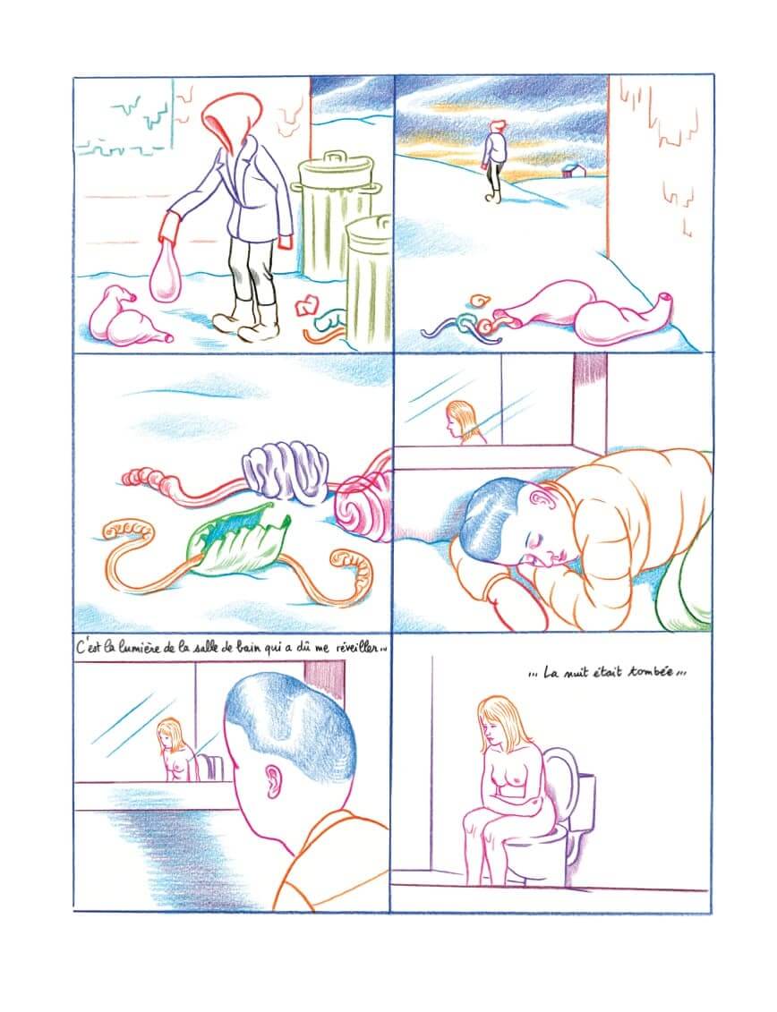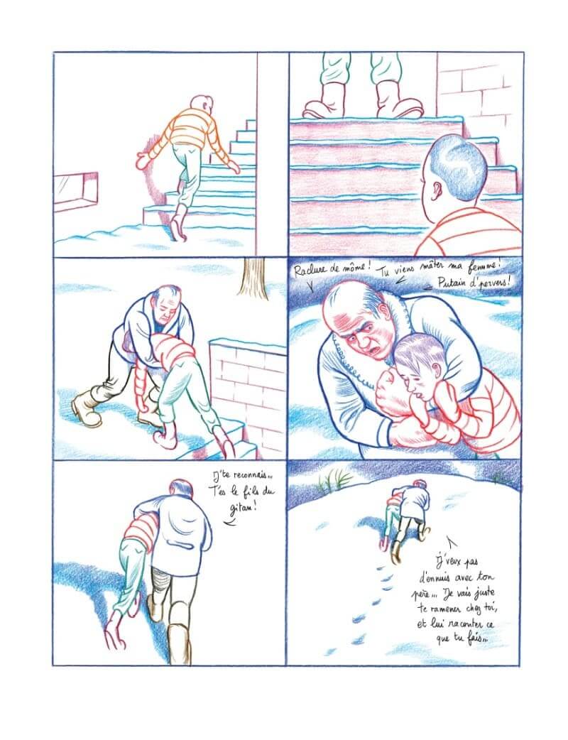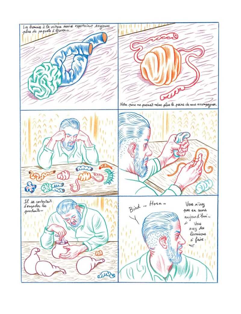 Résumé de l’éditeur : Fraîchement installés dans un petit village, trois enfants, Bird, Twombly et Horn, vivent avec leur père, un homme autoritaire qui subsiste en effectuant de mystérieuses livraisons. À l’école, les adolescents se confrontent aux autres et expérimentent peu à peu leur sexualité, à la grande déception de leur impitoyable géniteur qui décide de leur administrer une terrible punition. Mutilée et tourmentée, la fratrie évolue tant bien que mal, jusqu’au jour où le patriarche trouve le salut dans la religion… Ludovic Debeurme signe ici une œuvre puissante qui nous immerge instantanément dans son univers. La narration, poétique et entraînante, est rehaussée par une technique impeccable. Dans cet album, Debeurme opte pour un dessin aux crayons de couleur qui confère à l’ouvrage un aspect somptueux et chimérique. Construit comme un flashback, Un Père vertueux peut se lire indépendamment du premier opus tout en marquant un point final à l’ensemble du récit.