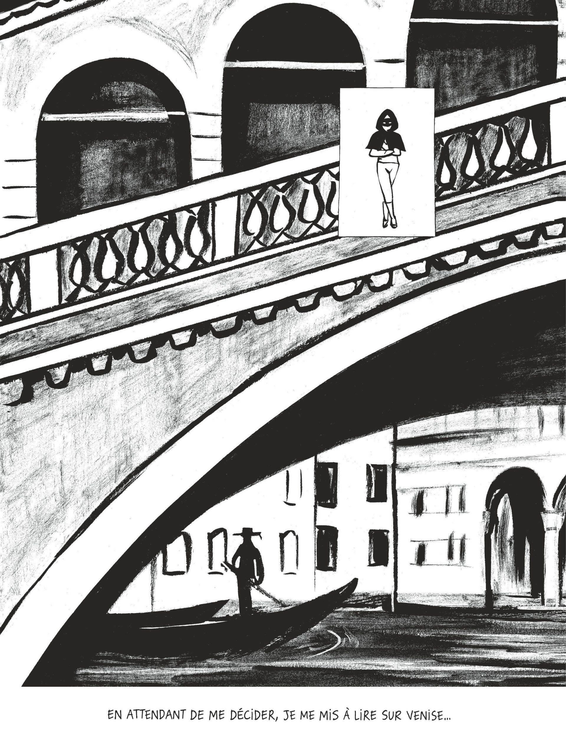 Ainsi, seule à bord de sa gondole, Nine Antico effeuille à travers sa bande dessinée, la ville autant qu’elle-même. Des clichés qui habillent Venise comme celle d’une femme, elle raconte le derrière, la complexité, casse le vernis de façade. La cité italienne devient métaphore de son incarnation : ses canaux sinueux sont ceux de son esprit, ses passages obscurs, les recoins sombres de son histoire. S’ajoute l’idée du costume, du masque, du paravent.