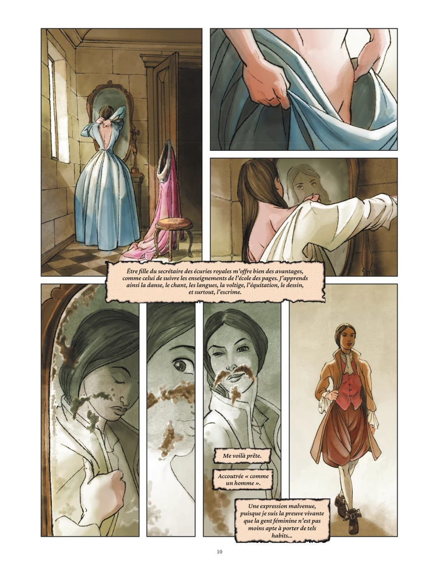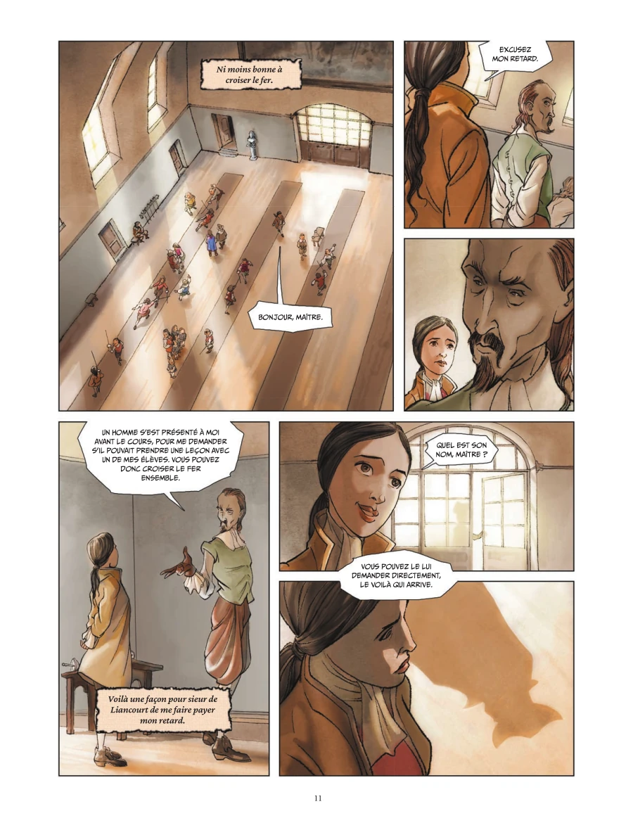 Inspirée d’un roman historique de Jean-Laurent Del Socorro, la nouvelle bande dessinée de Dominique Monféry, Une pour toutes, transporte le lecteur à la cour de Versailles, en l’an de grâce 1688… C’est là, à l’école des pages de la Petite Écurie, que l’on fait la connaissance de la belle Julie d’Aubigny, dont le père est secrétaire des écuries royales. Une position sociale qui a permis à la jeune femme d’apprendre la danse, le chant, les langues, la voltige, l’équitation et surtout, l’escrime…
