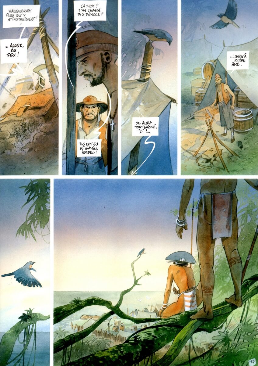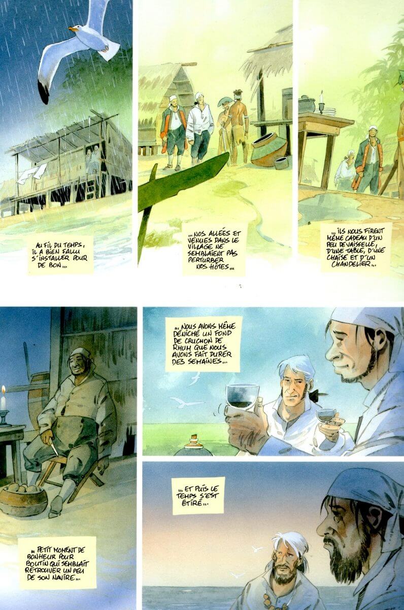 Parsemés de rencontre exotique (avec un petit enfant), d’espoir classique dans ce genre d’intrigue, d’oiseau symbolique (messager de Dieu) ou de pertes humaines marquantes, Vanikoro offre tous les ingrédients pour que cette aventure soit captivante du début à la fin. Sans temps mort, on se demande comment va bien pouvoir s’en sortir cette poignée d’hommes dont, soyons honnêtes, le destin ne donne pas lieu d’être optimiste. C’est aussi l’occasion d’observer l’instinct de survie que tout être vivant peut avoir, même dans la pire des impasses. Parfois motivé, certes, par un précieux coffre au trésor…