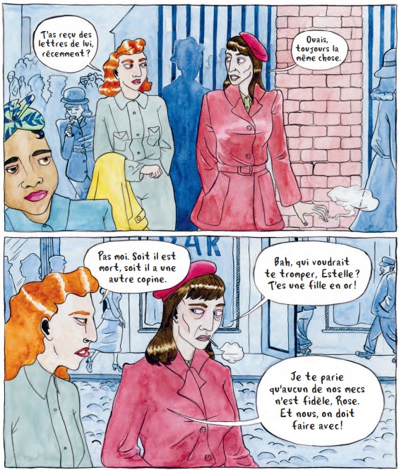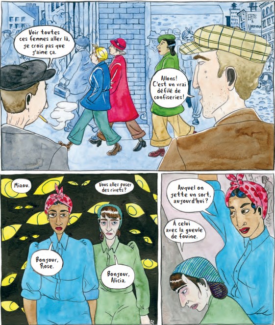 Telles des Rosie la riveteuse, les femmes ont adopté l’uniforme de travail. Et ce n’est qu’une fois le travail terminé, qu’elles revêtent leurs tenues habituelles qui leur permettent de retrouver leur féminité. Mais pour Rose, sa féminité elle la retrouve également dans les bras de celui qui est devenu son amant.