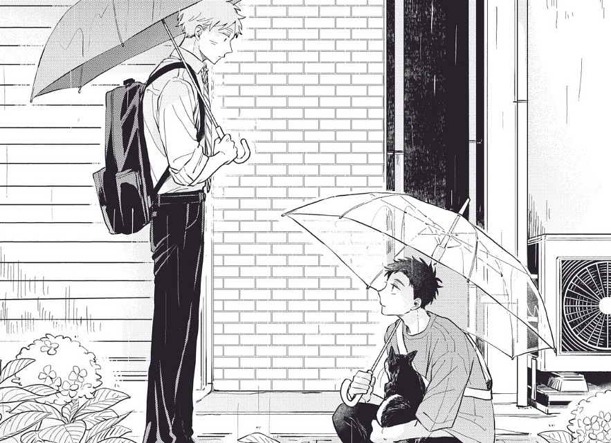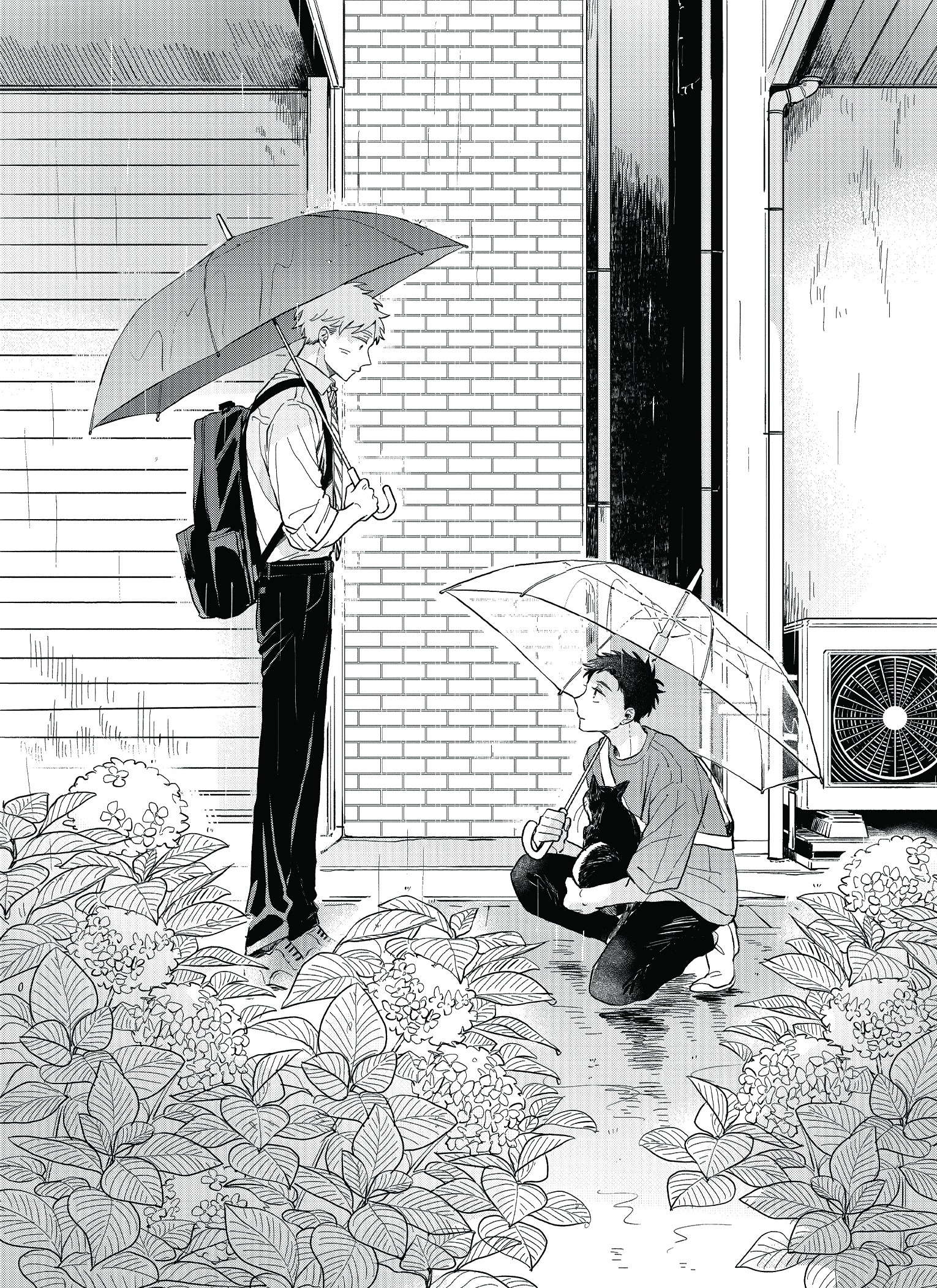 Résumé de l’éditeur : Takeda est professeur de japonais et Arita est fleuriste. Camarades de classe au lycée, ils ne s’étaient plus revus depuis la fin de leurs études. Mais un jour de pluie, leur relation évolue lorsqu’ils viennent en aide à un chat. Ils n’ont pas de sentiments amoureux l’un pour l’autre, ni même de raison particulière de vivre ensemble. Pourtant, c’est lorsqu’ils sont aux côtés l’un de l’autre qu’ils se sentent le plus à l’aise. Ils ont une relation différente des couples, des amis ou encore d’une famille. Mais ils apprécient passer du temps ensemble.