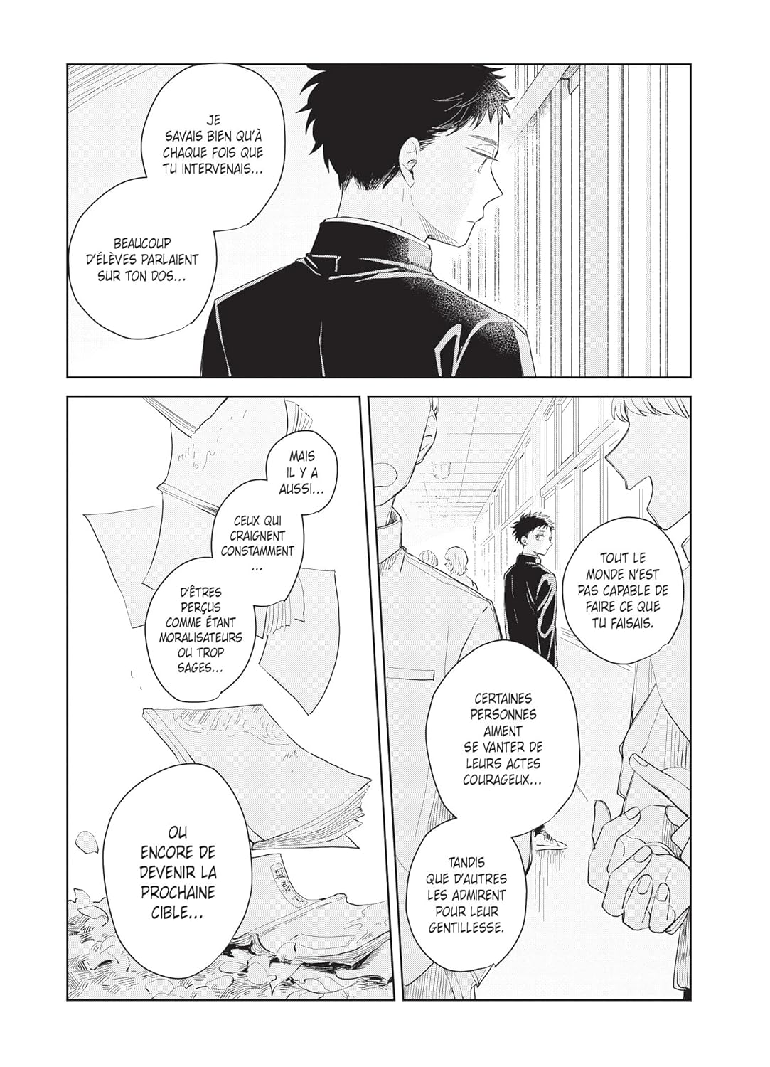 Lorsqu’on appose un nom à une relation, on peut avoir tendance à vouloir correspondre à cette définition, un cadre qui peut empêcher de voir l’autre dans son entièreté. Bien que cela ne signifie pas que toutes relations ne doivent pas être nommées, cela permet parfois de mieux réfléchir à ce qui constitue une personne en tant qu’individu et le type de relations qu’on entretient avec elle. Et par ce respect mutuel qu’ont Takeda et Arita, ils parviennent à observer chacun avec clarté.
