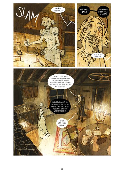 On est plongé dans une pure poésie illustrée et contée. Cette ambiance onirique, à la limite de la folie, se fait ressentir à toutes les pages avec ses couleurs tantôt lumineuses ou sombres