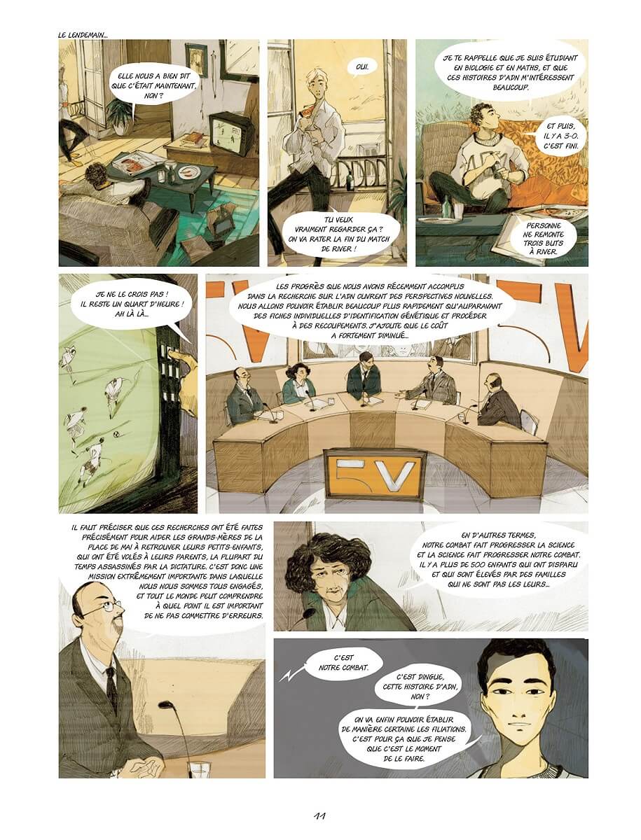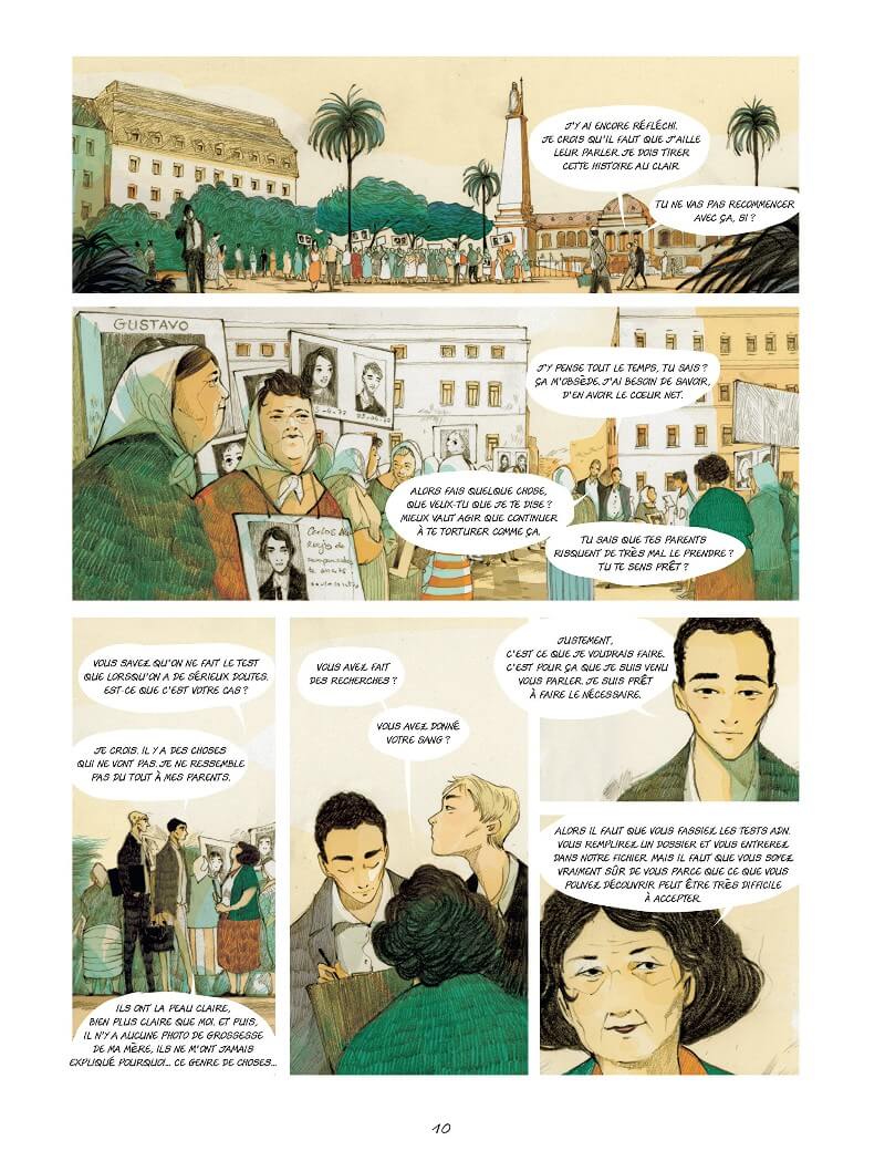 Résumé de l’album : En Argentine, de 1976 à 1983, sous la dictature militaire, 500 bébés ont été arrachés à leurs mères pour être placés dans des familles plus ou moins proches du régime. Plusieurs années après cette tragédie, les grands-mères de ces enfants ne cessent de se battre pour les retrouver. Interpellé par ce drame largement médiatisé, Mario, un jeune homme de 20 ans qui s’interroge sur sa filiation décide d’aller à la rencontre de ses grands-mères accompagné de son ami Santiago et décide de faire un test ADN, Les résultats bouleverseront les vies des deux jeunes gens et de leur entourage. A travers leur quête, on s’interroge sur l’identité, la filiation, la capacité de chacun à se confronter à ses propres bourreaux, à surmonter une trahison et parvenir à envisager un nouvel avenir.