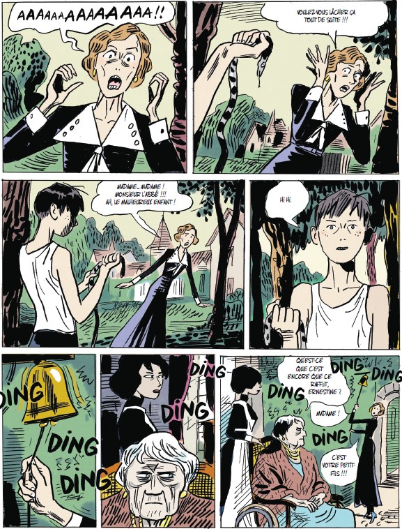 Les adaptations télévisuelle (1971) et cinématographique (2004) de Vipère au poing nous avaient représenté Folcoche sous les traits d’Alice Sapritch et de Catherine Frot. La mère imaginée par Frédéric Rébéna semble nettement plus jolie. Mais elle n’en est pas moins terrifiante. La froideur se sent sur ses traits dès sa première apparition sur le quai de la gare. Comme si un masque de répugnance vis à vis de ses deux aînés s’était fixé irrémédiablement sur son visage.