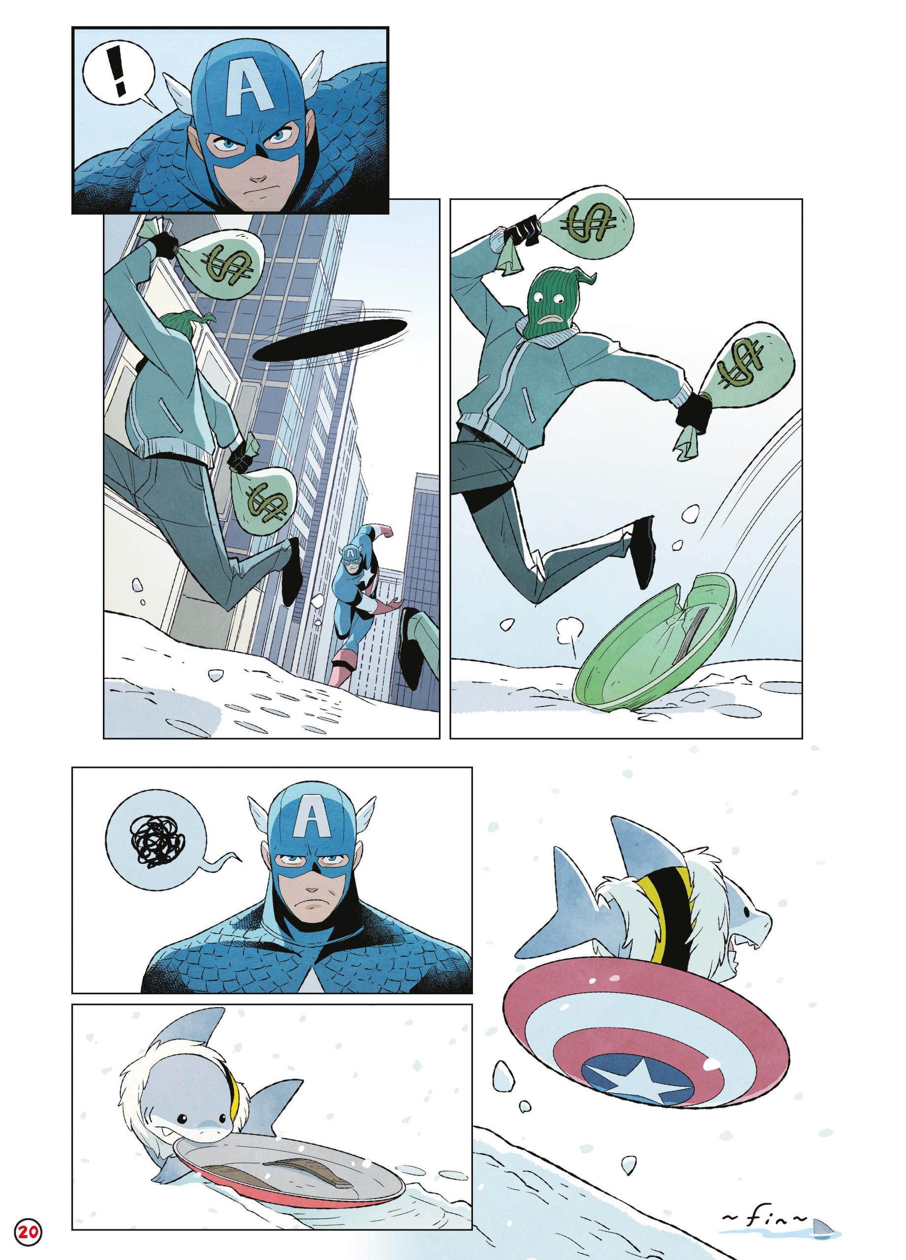 La scénariste Kelly Thompson, à l’écriture sur de nombreux titres classiques de la maison d’édition, livre ici des gags vraiment très sympas. En deux pages, elle parvient à rendre adorable et attachant le petit requin. Même en tant qu’adulte, le sourire vient facilement au visage. Elle joue à merveille avec la nature du personnage, entre poisson et « petit chien », pour le plonger dans des aventures quotidiennes simples mais ravissantes.