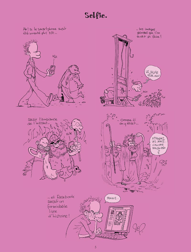 Rapidement les pages vues par le public se multiplient, atteignant même un million en deux jours grâce à l’un de ses premiers posts sur la sexualité des super-héros. Pêle-mêle, il se met en scène avec ses enfants, faisant du sport, insomniaque, au musée, cherchant un cadeau pour Noël ou ayant des problèmes ophtalmiques. Sans filtre et avec beaucoup d’autodérision, Zep fait sourire et fait rire par ses pages poétiques, parfois sexuelles, parfois fondées sur des thématiques fortes, ses pages font aussi passer un excellent moment de lecture.