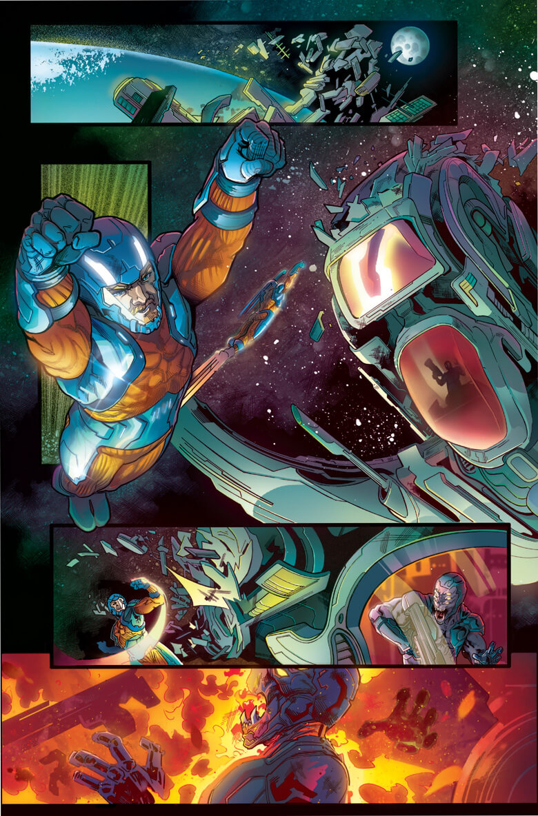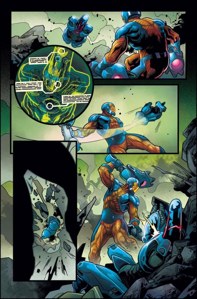 Par ailleurs, en bonne série d’action qui se respecte, X-O Manowar comporte son lot de scènes de combat. Ces dernières sont parfaitement orchestrées par un Emilio Laiso particulièrement inspiré. Vives et expressives, les planches brillent par leur diversité. La colorisation pétillante de Ruth Redmond est à l’unisson, et bien vite, on se laisse emporter par ce flot dynamique et trépidant.