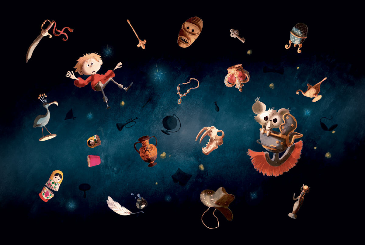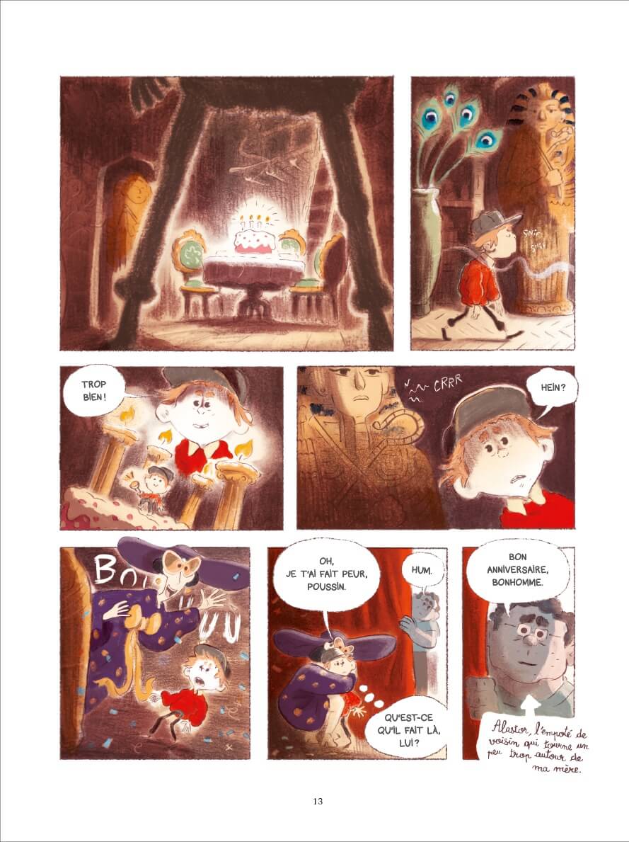 Ce petit garçon est chouchouté par une mère poule, qui est extravagante et un peu folle. Leur maison est un faite de bric et de broc ; c’est un musée des curiosités. Anaïs m’avait indiqué que la mère devait être excentrique et que dans la maison il devait y avoir des statues et des ossements. Elle m’a d’ailleurs envoyé des photos en cela et c’était ensuite à moi de composer.