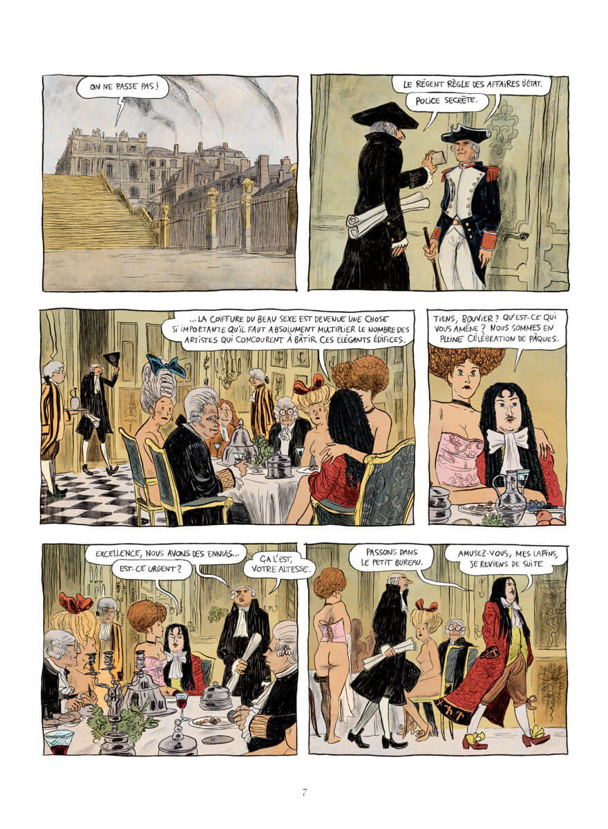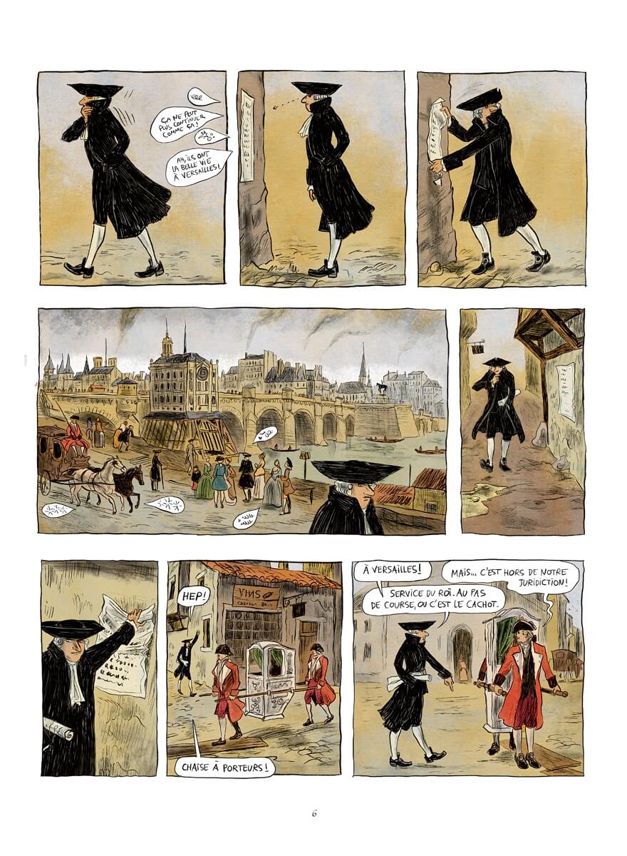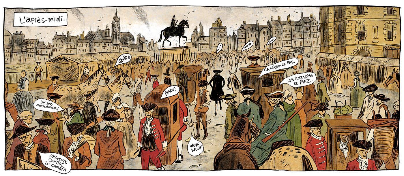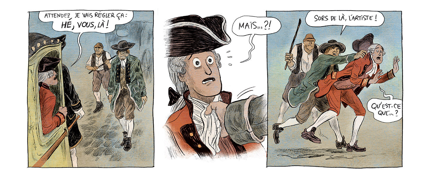 J’aime vraiment changer d’univers d’une série à l’autre parce que je ne veux pas dessiner éternellement la même chose. J’aime tout changer, y compris les procédés. Le fait d’être dans le XVIIIe, dans un « film à costumes », ça m’a énormément plu. J’aime bien trouver des « niches » et la peinture française de cette période représente peu Paris et la vie quotidienne. C’est plutôt une peinture soit religieuse, soit de portraits de nobles. Nous n’avons pas ce qui se fait en Hollande à ce moment-là où l’on peut voir des scènes de rues.