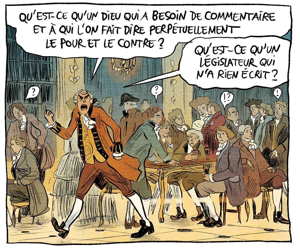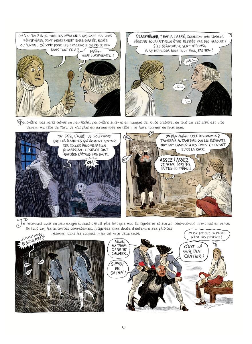 Je n’ai pas le temps de continuer parce que je démarre trois séries simultanément – Voltaire plus une chez Dargaud et une autre chez Rue de Sèvres – et c’est Thomas Gilbert que nous avons choisi avec Stéphane Melchior pour reprendre la série et fera la trilogie suivante. Je trouve qu’il a un dessin lâché qui fait que ce sera un peu dans le même esprit, avec sa personnalité à lui mais ce ne sera pas du copier-coller. Je suis arrivé au bout du premier roman, je n’abandonne pas le navire mais je passe le flambeau.