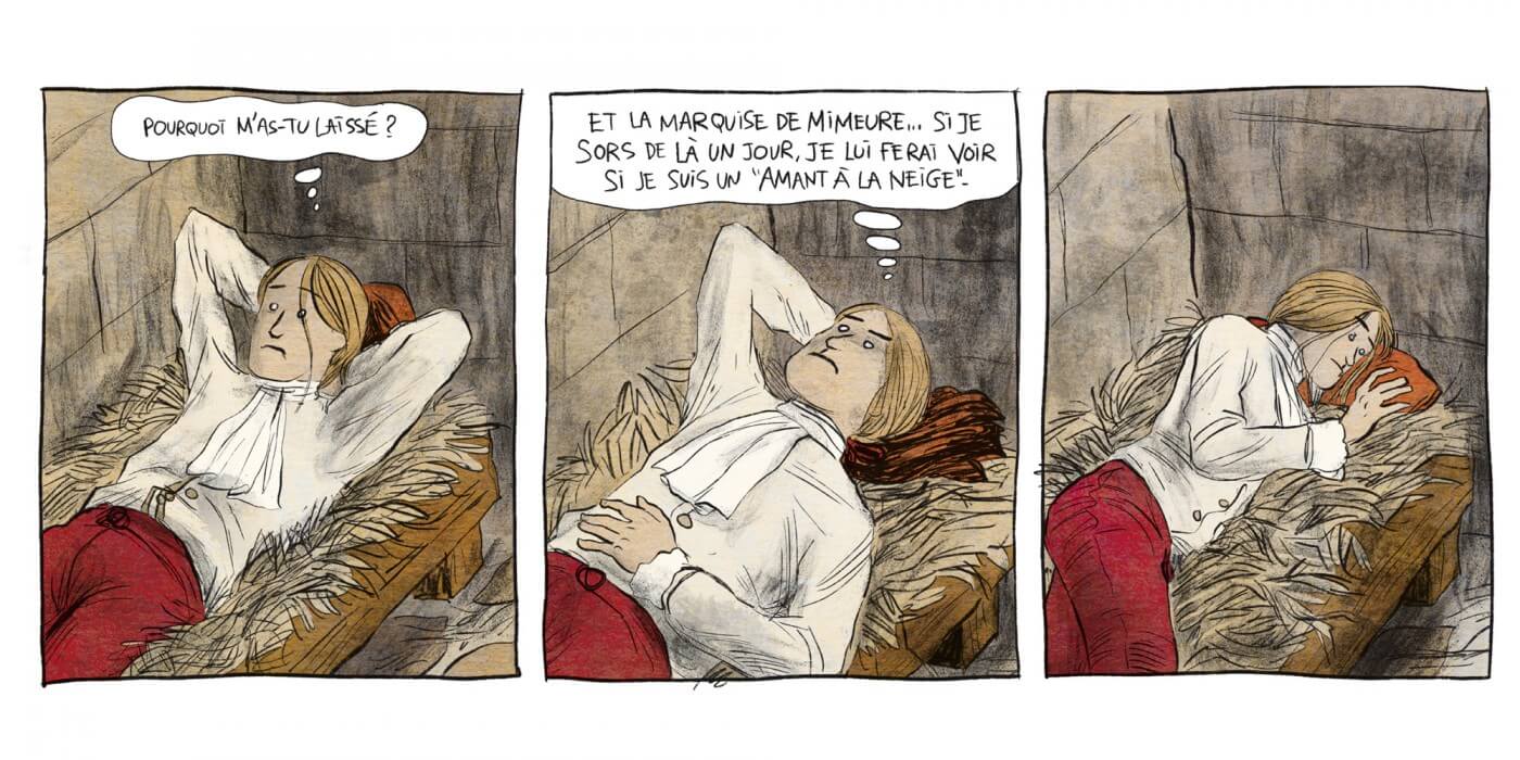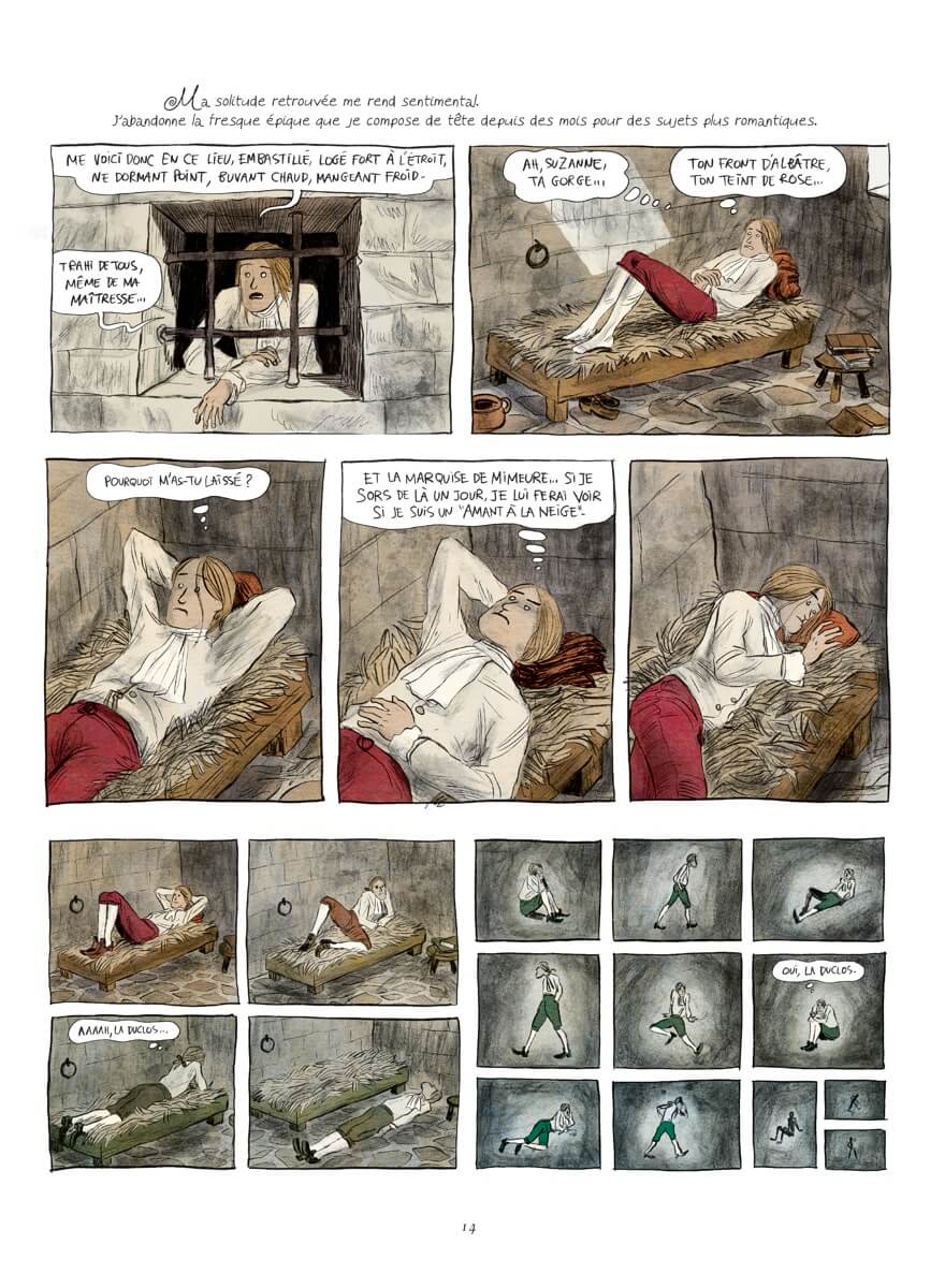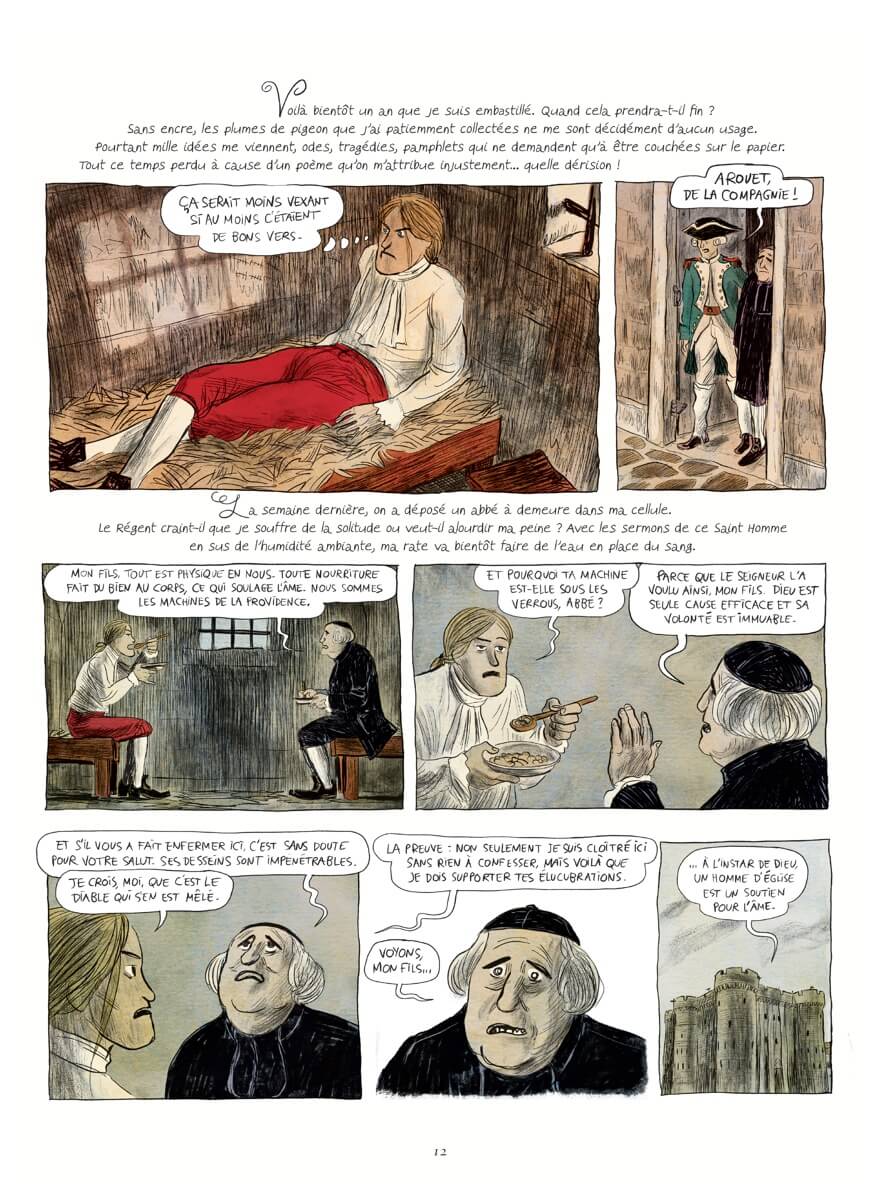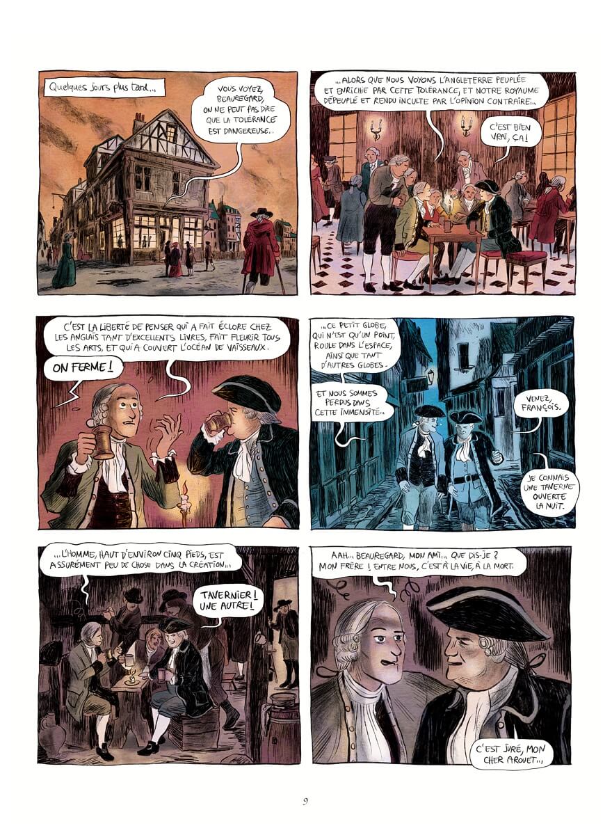 Il y a un autre point – juste ébauché dans le premier volume – c’est son rapport aux femmes et en particulier une : Emilie du Châtelet, une scientifique et mathématicienne surdouée qui sera sa compagne pendant 10 ans. Ce qui est touchant chez lui mais qui n’entre pas dans les mœurs du XVIIIe siècle, c’est qu’il veut trouver quelqu’un qui soit son égal. Elle l’influence énormément et il s’initie notamment à la science avec elle. Ensemble, ils vont à l’Académie des Sciences et font des recherches sur le feu. Ils sont newtonniens quand tout le monde est cartésien. Ils ont une vraie vie intellectuelle ensemble, ils vont au théâtre ensemble… Il est de ce fait très moderne. Une autre chose étonnante, il est aussi l’un des premiers défenseurs des animaux, considérés seulement comme des machines à l’époque. Il a même écrit des contes sur ce thème. Il est très sensible à leur sort.