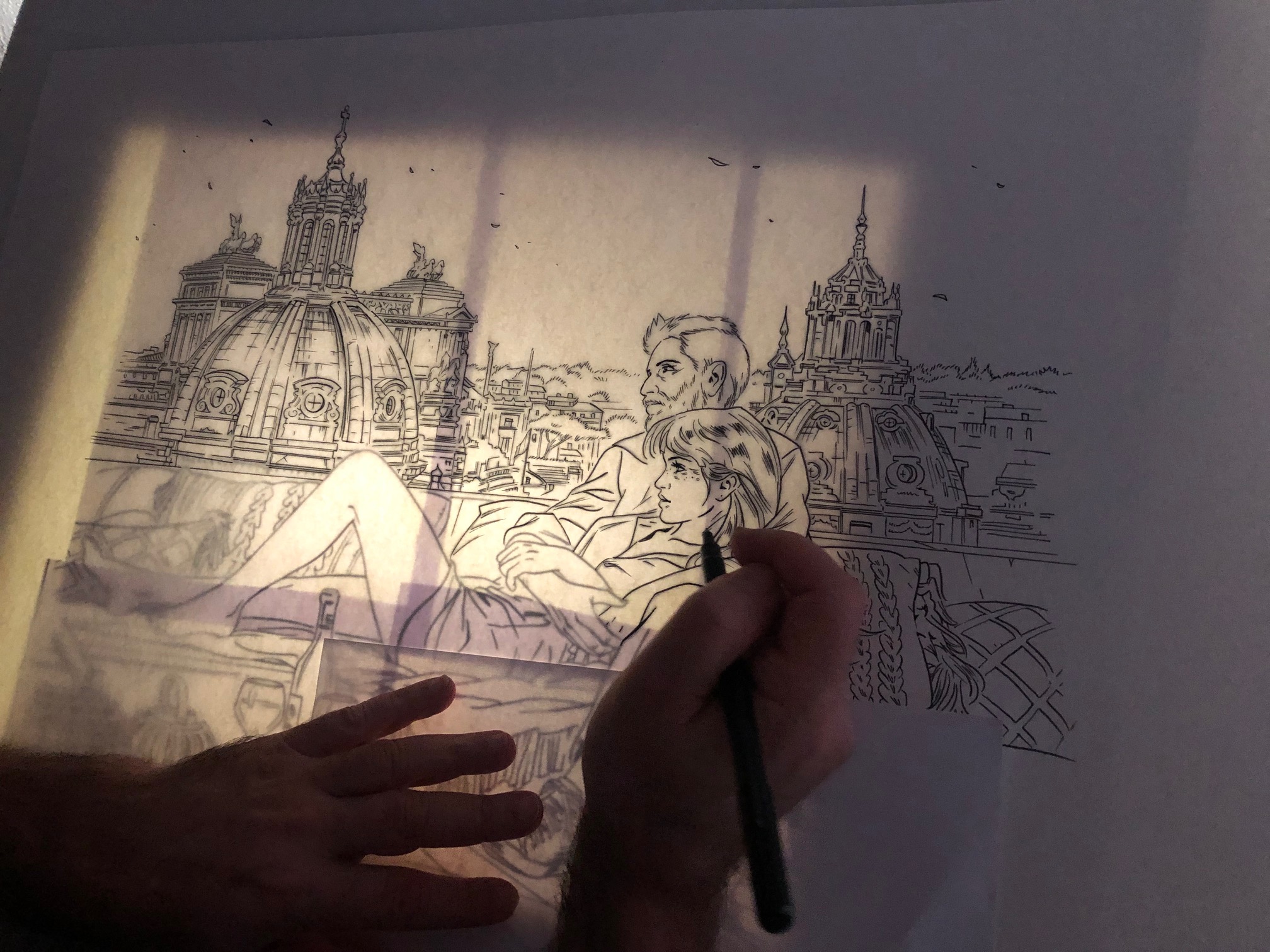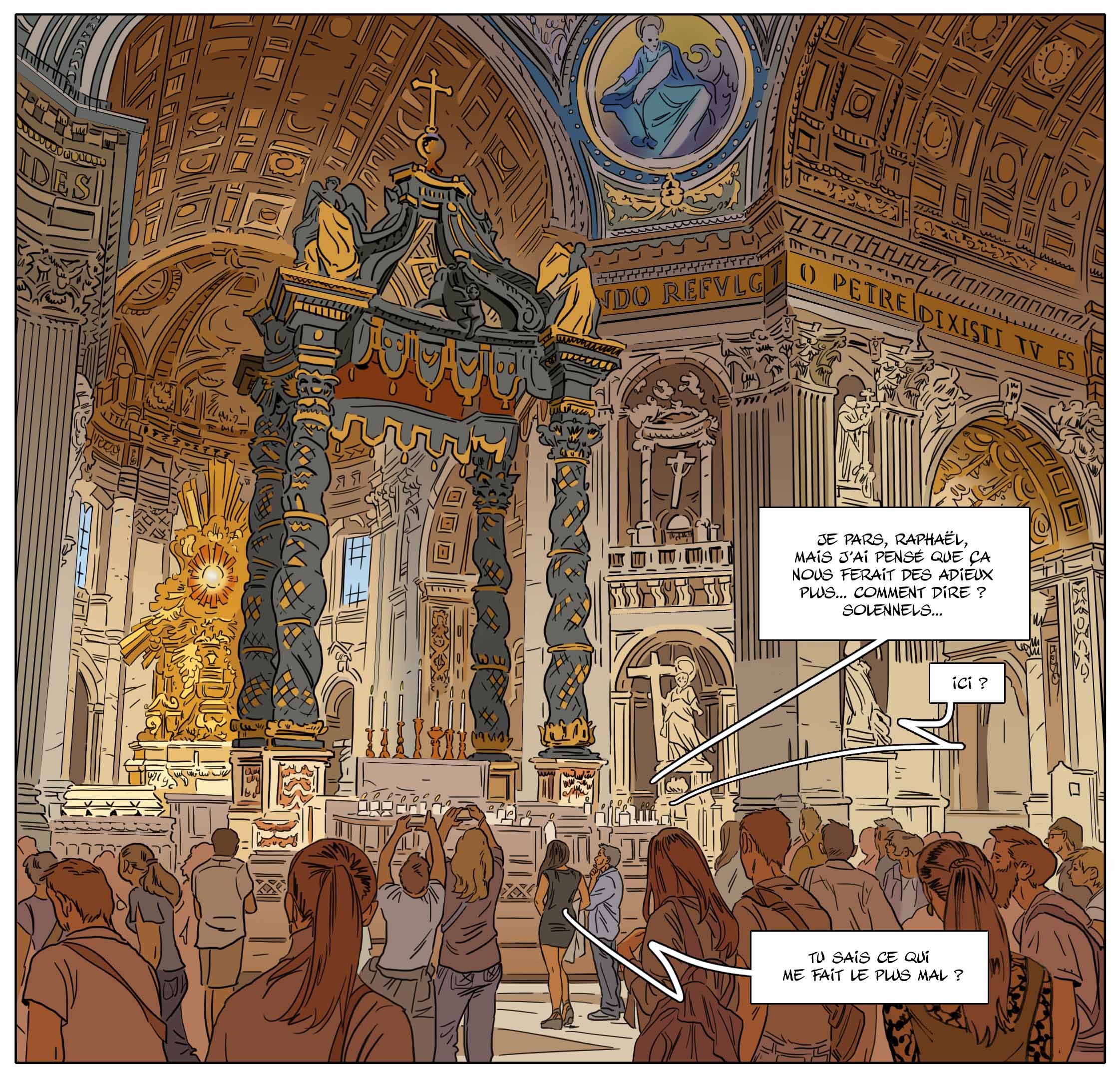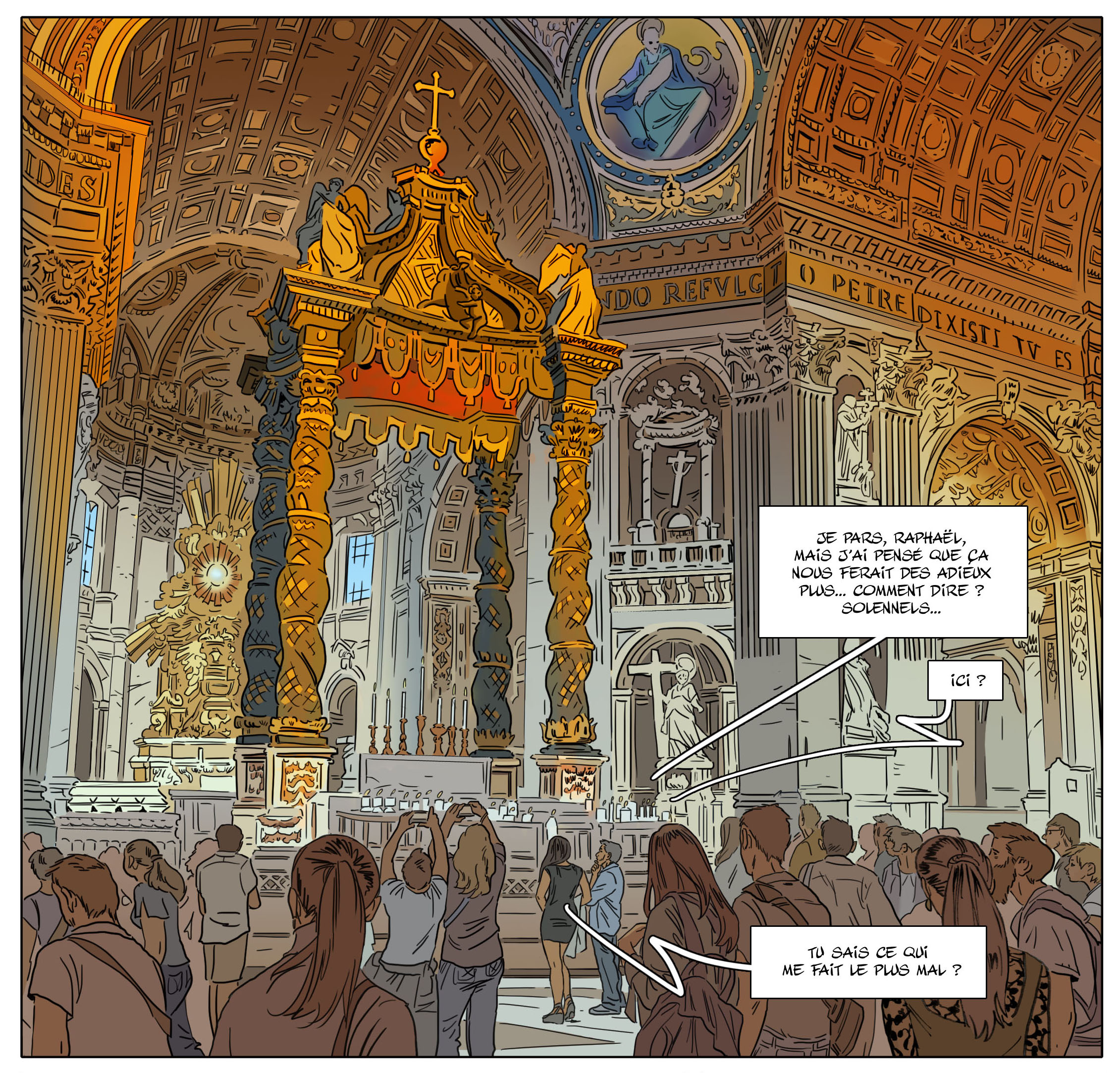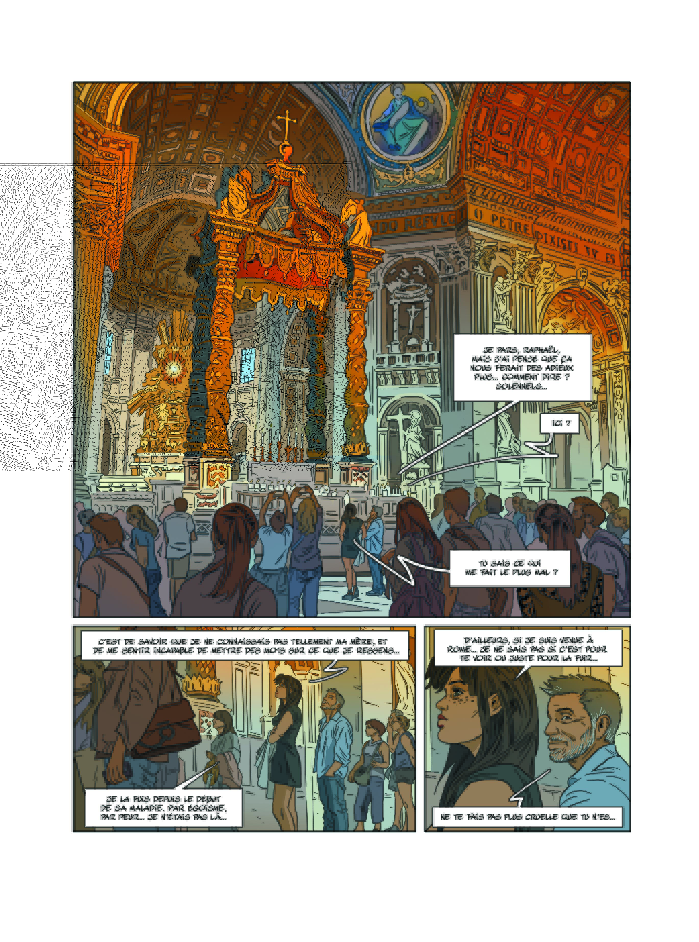 À trois mois de sa sortie, tu as déjà choisi et présenté la couverture de l’édition classique. En martelant l’importance du choix des bonnes nuances de couleur. L’occasion de mettre une nouvelle fois en valeur le travail de ton épouse et coloriste Delphine. Comment perçoit-elle la fin de Nuit à Rome ?