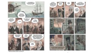 J’aime l’idée de me confronter à une époque que je n’ai pas connue, que plus personne ne vit. Il a fallu que je me documente pour que ce soit réaliste. Le bateau page 16 est vraiment celui du capitaine Cook. Pour les rues et bâtiments de Londres, je me suis basé sur des gravures d’époque.