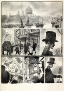 J’ai toujours aimé l’ambiance victorienne à la Sherlock Holmes dans les films ou les livres. C’était pour moi une vraie partie de plaisir que de dessiner ces planches à Londres. Je suis d’ailleurs assez mal à l’aise dans des décors plus actuels.