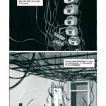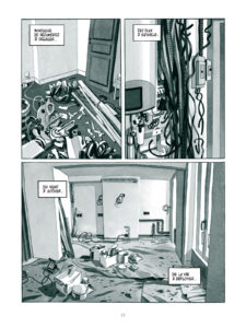 Ce que j’ai fait sur Sang neuf, ça a l’air beaucoup plus simple et pourtant, c’est beaucoup plus difficile. Ça prend beaucoup moins de temps. Sauf que tu peux te planter une fois, deux fois, tu déchires, tu refais. Parce que le résultat justement de ces gris et de ce noir sur ce blanc si c’est pas juste, ça ne marche pas. Je pensais que ce serait plus rapide. En fait, ça a été assez long, mais évidemment délicieux.