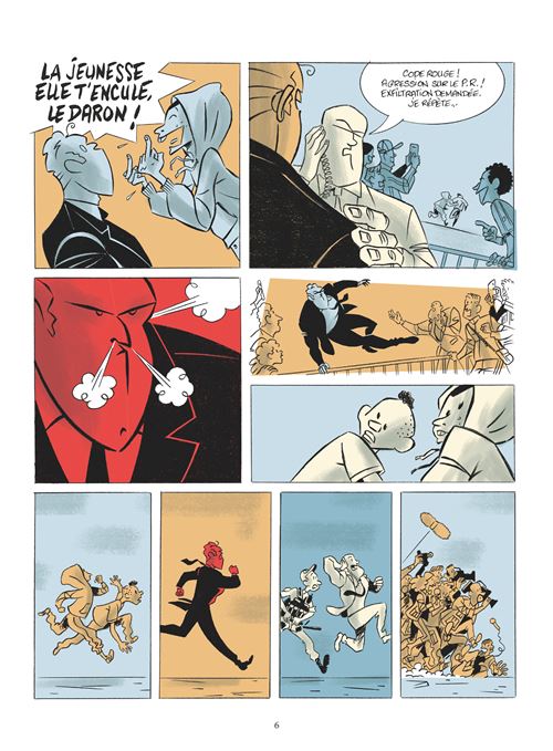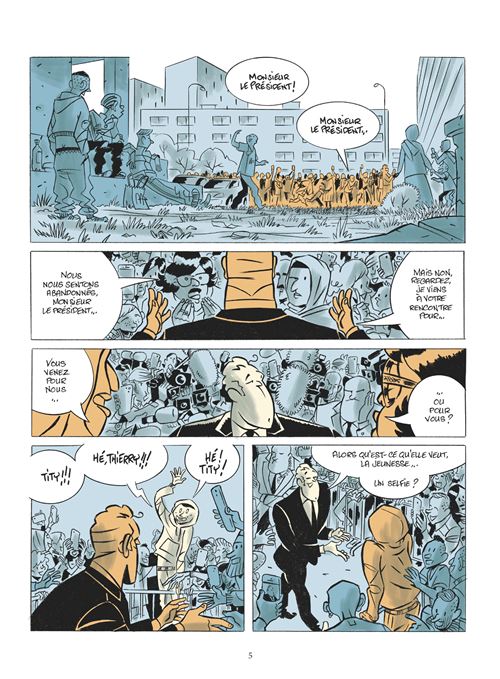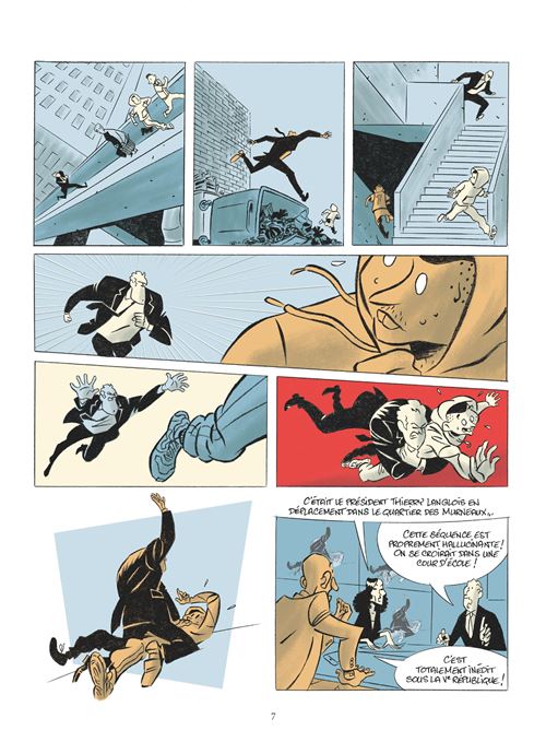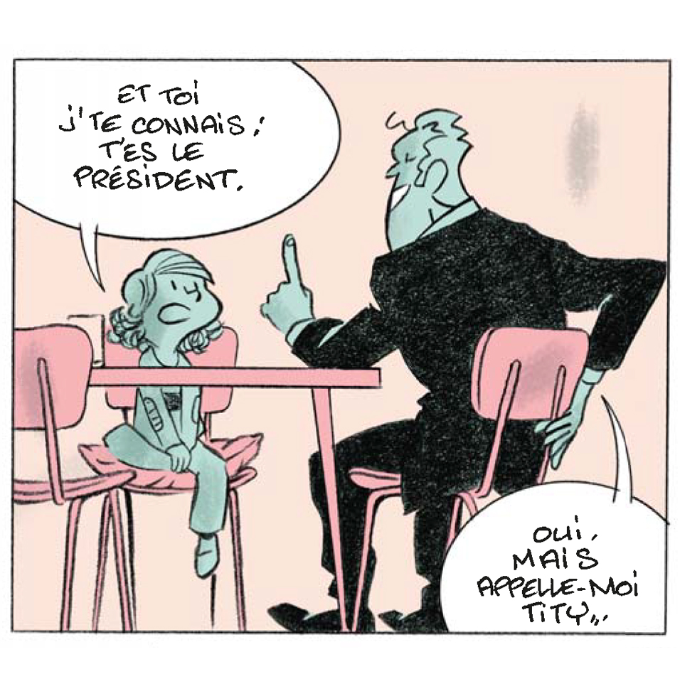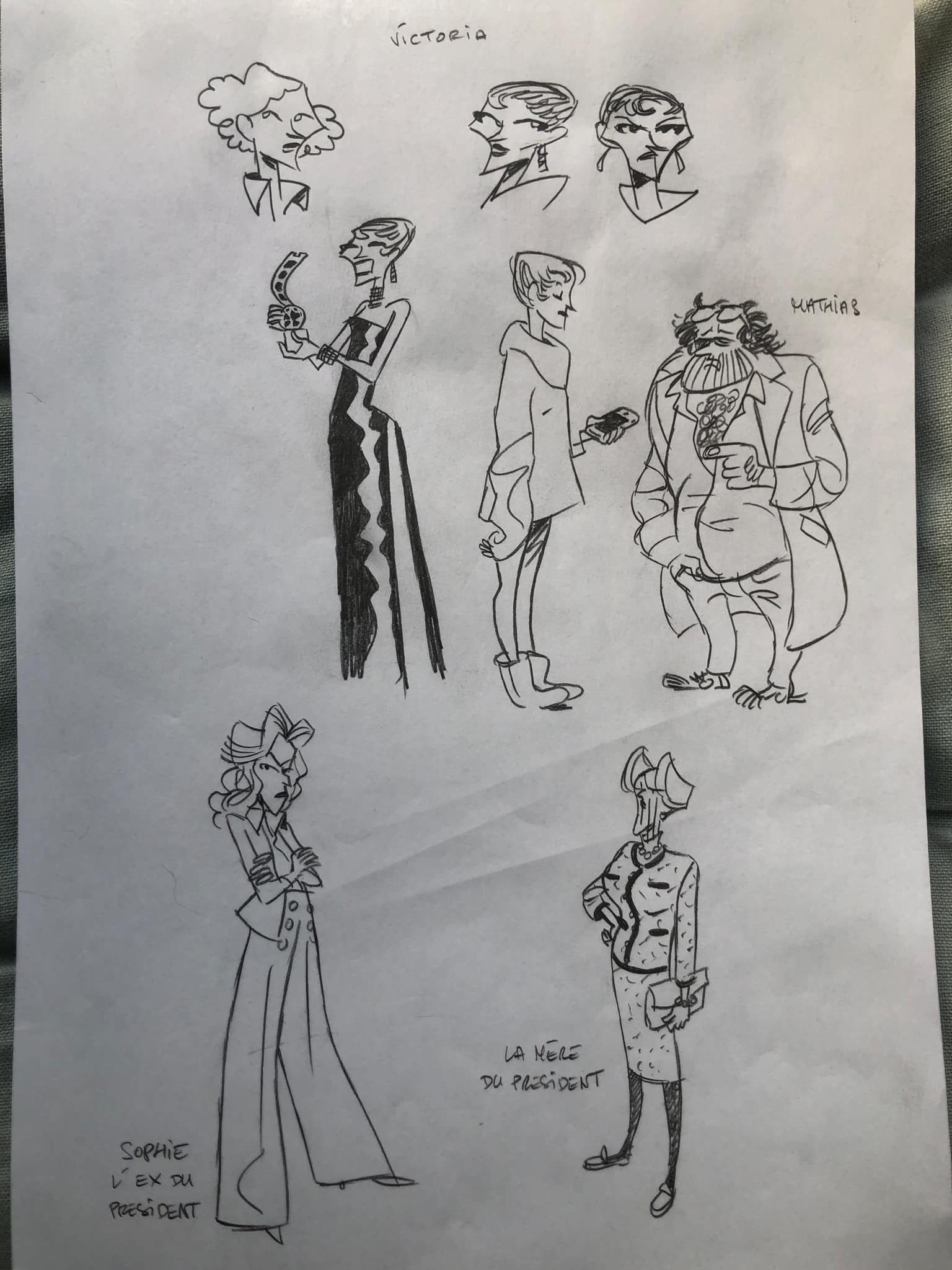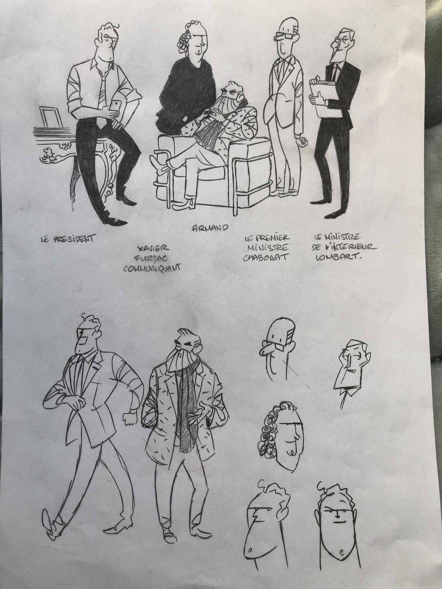 Ça m’amusait vraiment quand je découvrais les bouts d’histoire. J’essayais aussi de le faire rire en dessinant des gags visuels. Des choses grotesques comme les portables éclatés au sol par le président et les huissiers apportant un nouveau sur un petit coussin.