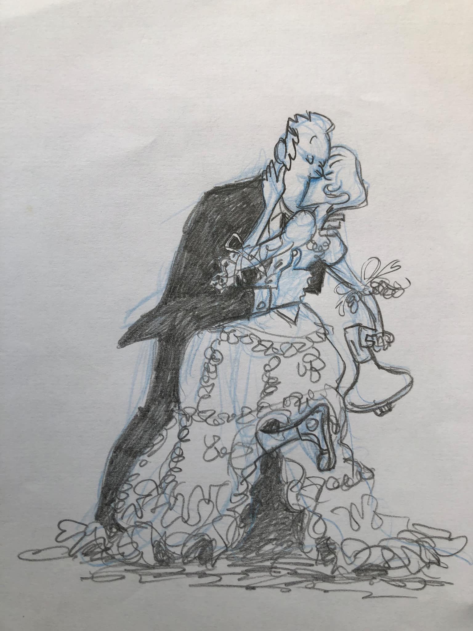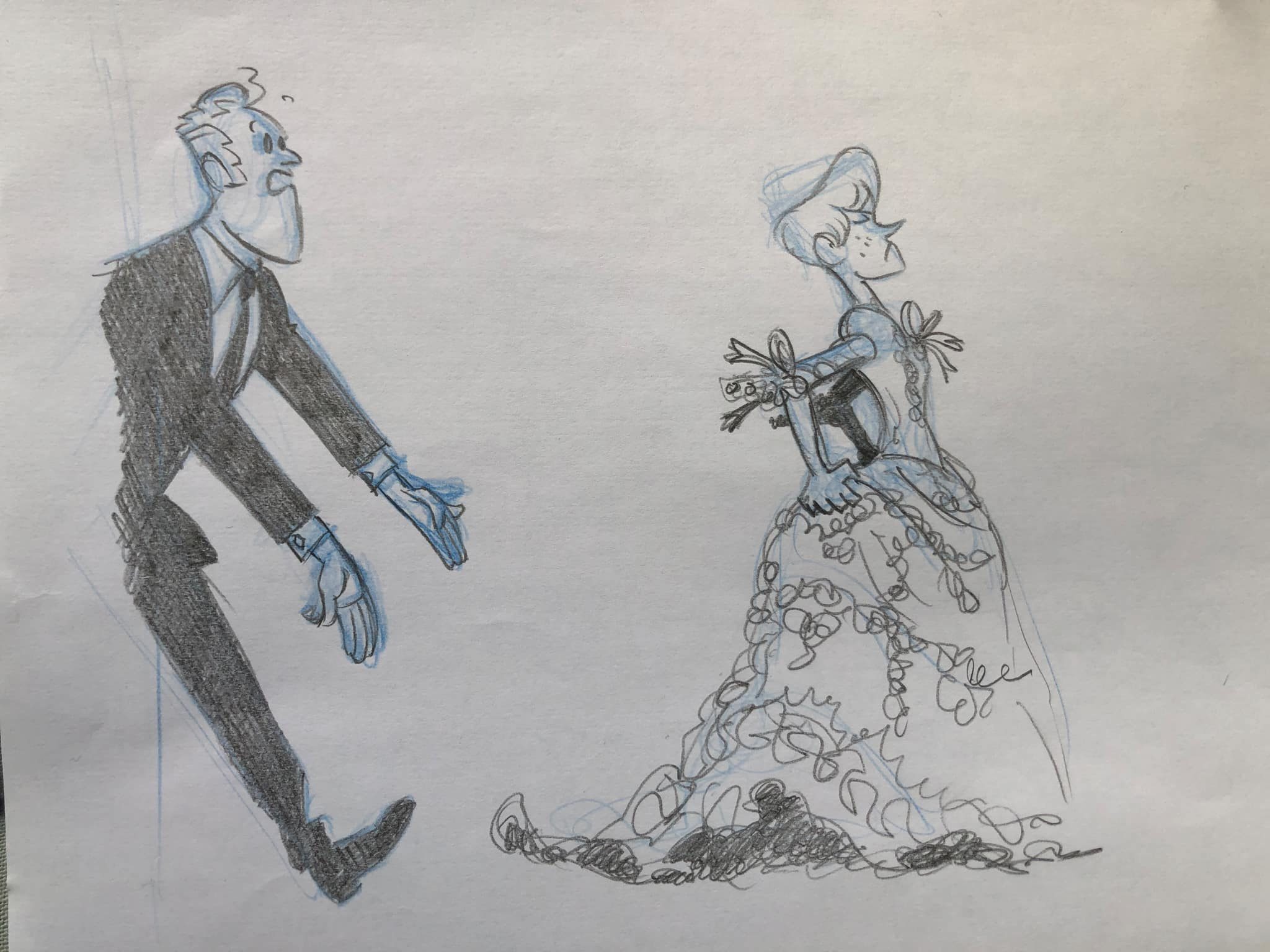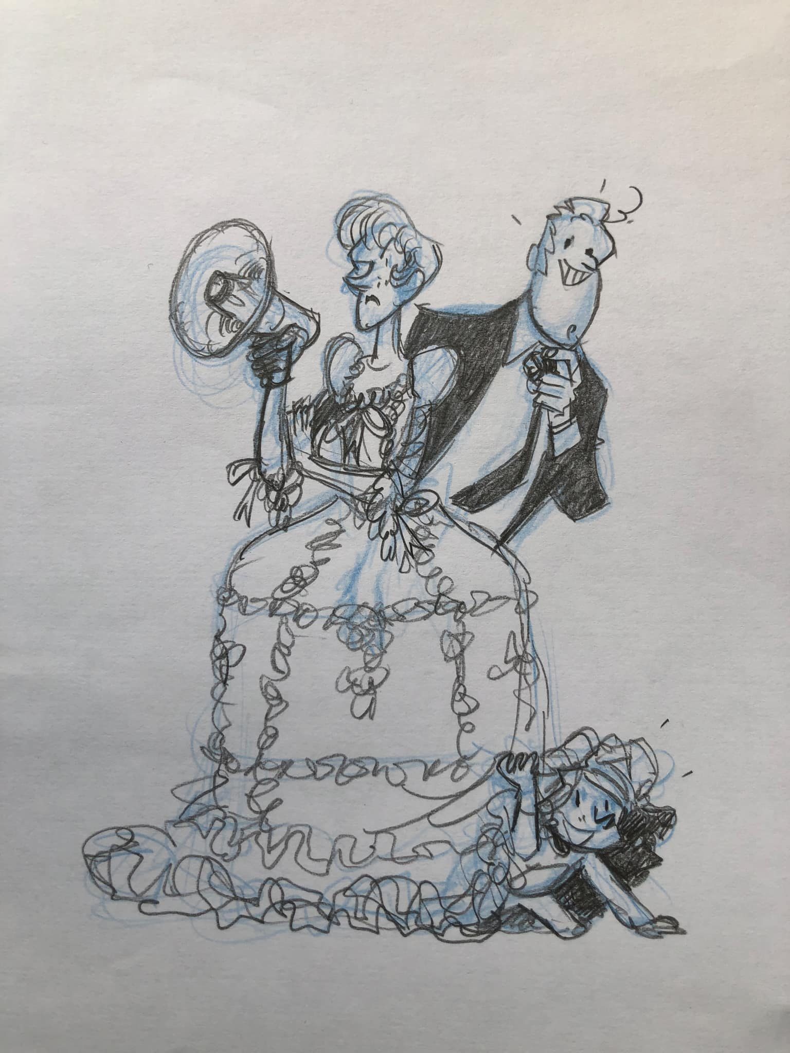 Je dessine tout au crayon de papier et j’ajoute la couleur en numérique. Comme pour Première dame.