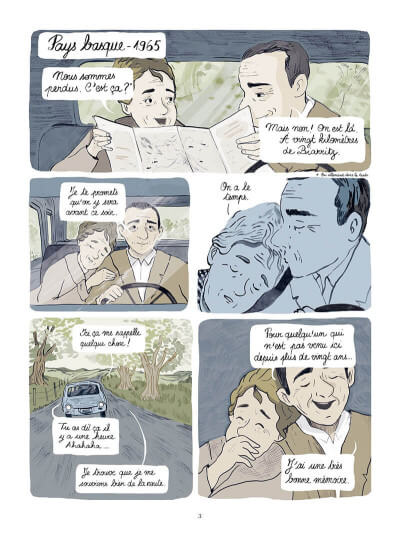 Résumé de l’éditeur : En 1967, un Allemand fait visiter le Pays basque à sa femme. Dans le bâtiment où il était cantonné durant la Seconde Guerre mondiale, et qui était alors une auberge, il retrouve par hasard Léo, jeune fille à l’époque. Cette rencontre inattendue plonge celle-ci dans son passé en la confrontant à ses souvenirs. Certains lui rappellent des moments agréables, d’autres se révèlent plus douloureux. Vingt-cinq ans plus tôt, Léo traversait la guerre en vivant en secret une histoire d’amour avec Félix, un soldat allemand, tout en travaillant comme serveuse dans l’auberge familiale avec sa grande soeur. Entre les contraintes matérielles et les instants fugitifs de bonheur, dérobés à un quotidien difficile et angoissant, la vie suivait son cours… À partir d’une photographie prise durant le conflit et retrouvée en 1961 par le mari de Léo, Mayana Itoïz – créatrice avec Wilfrid Lupano et Paul Cauuet de la série à succès Le Loup en slip – évoque le destin contrarié de sa propre grand-mère, dans un magnifique récit porté par un graphisme pictural subtil et une narration tout en légèreté.