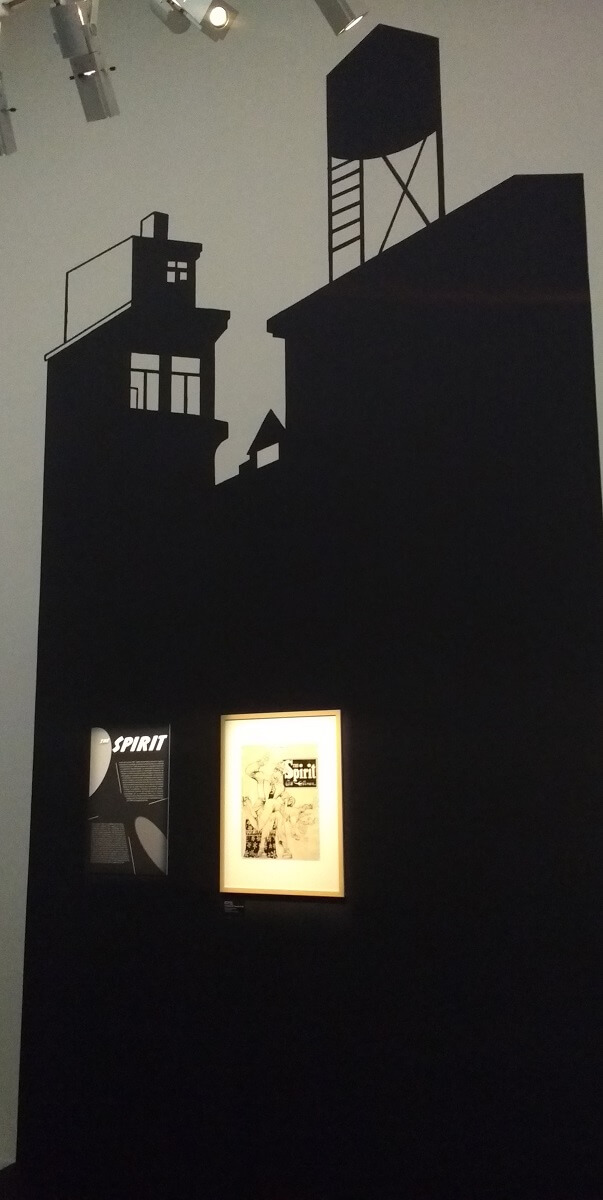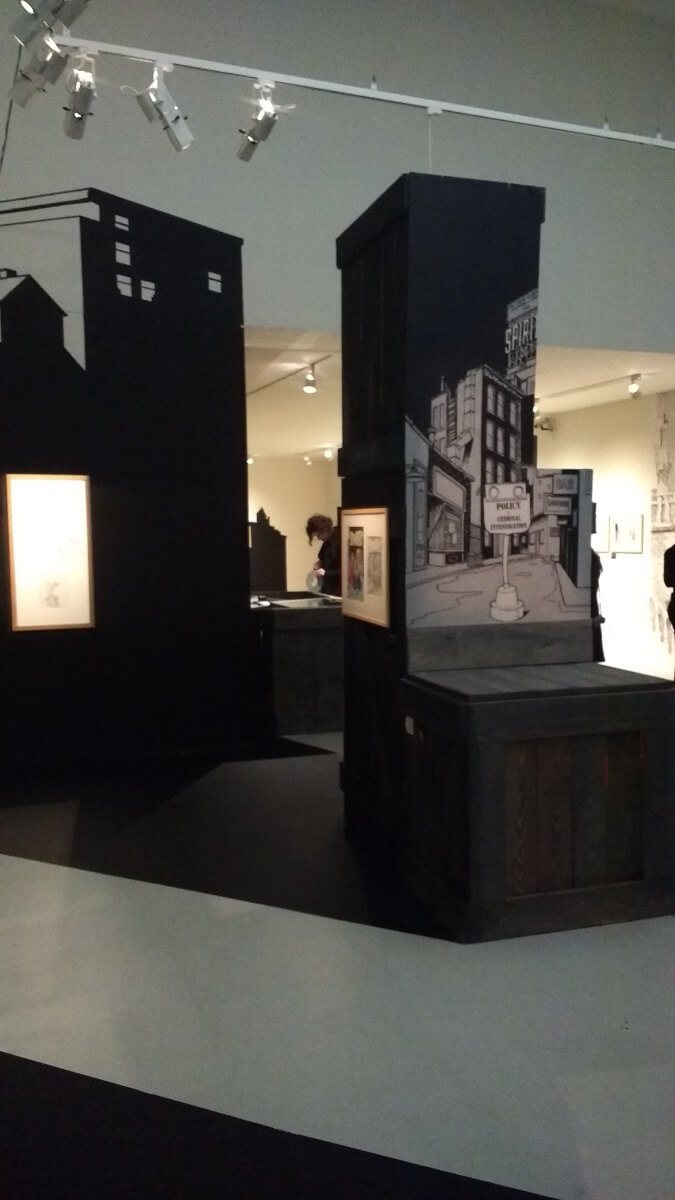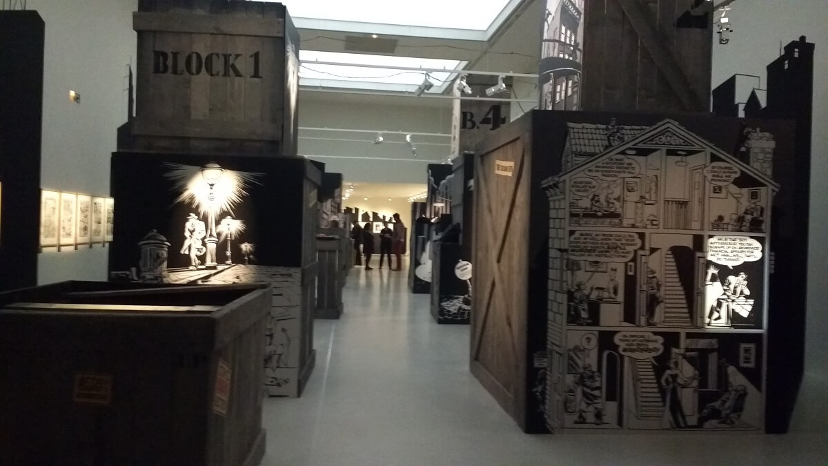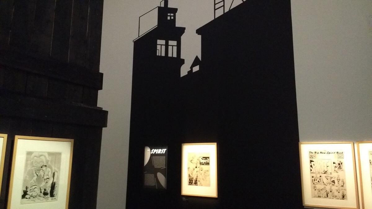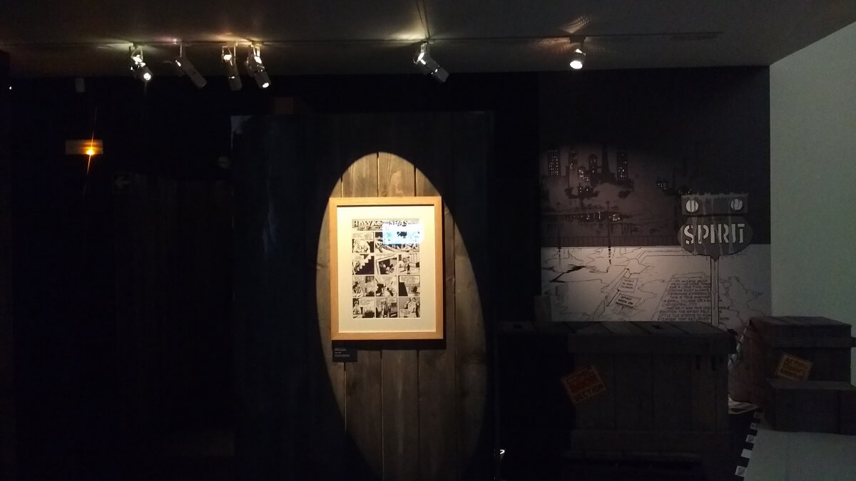 Ce qui frappe le visiteur lorsqu’il entre dans l’exposition Will Eisner, c’est la qualité et le soin apporté à la scénographie mise en scène par l’Atelier Lucie Lom. Il faut souligner que le commissaire d’exposition, Jean-Pierre Mercier est un des très grands spécialistes du monde du 9e art et qu’il a voulu mettre en lumière la magnifique œuvre du maître américain. Ainsi, des caisses énormes sont entreposées les unes sur les autres pour évoquer les buildings de Central City. Dessus ont été peintes de gigantesques illustrations du Spirit. Les planches originales couvrent les murs agrémentés d’ombres mais aussi les fameuses caisses en bois. Un scène de crime est reconstituée au début de la visite.
