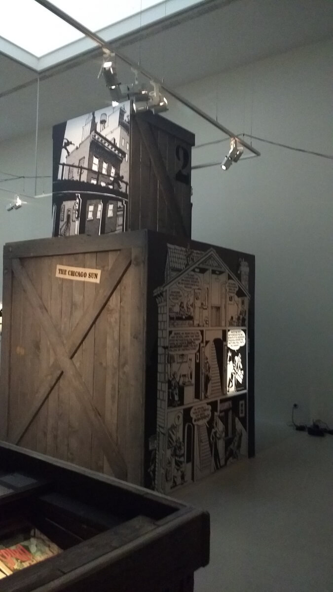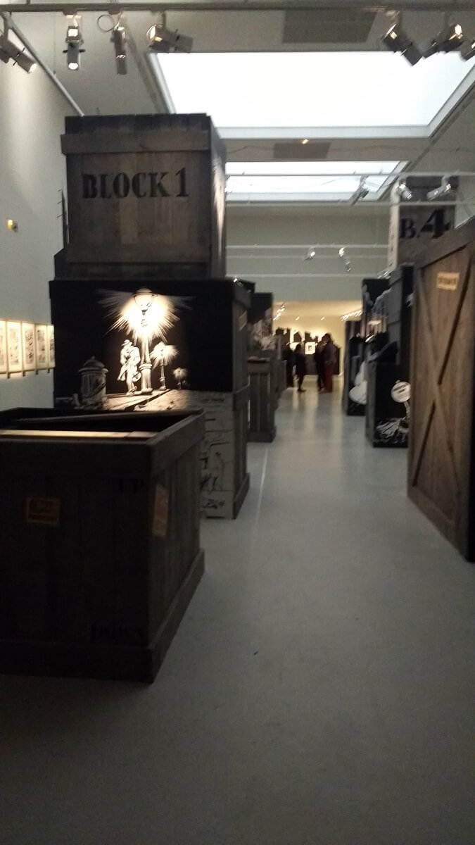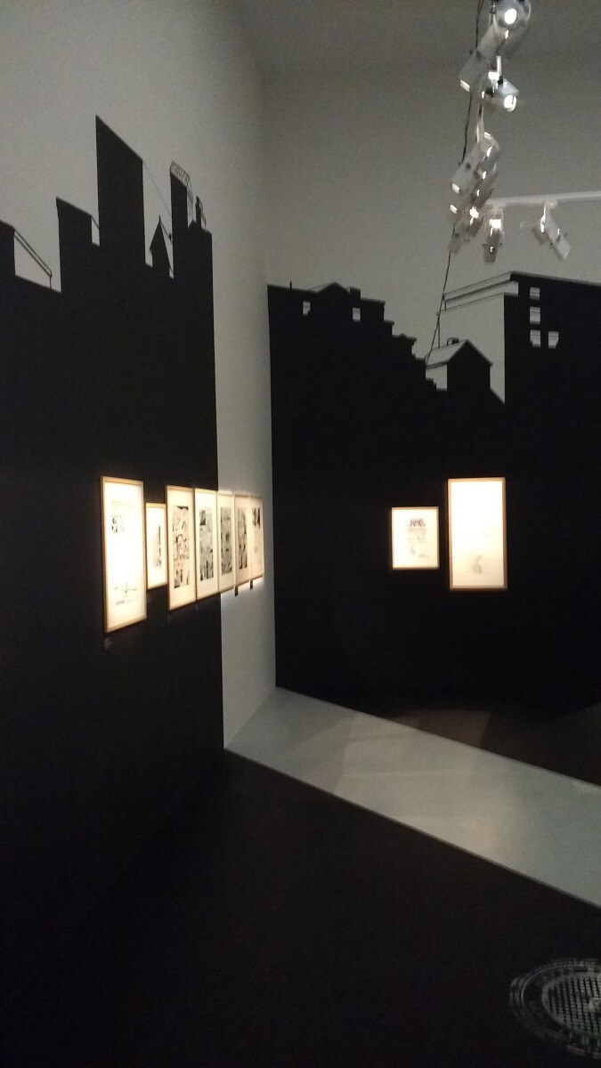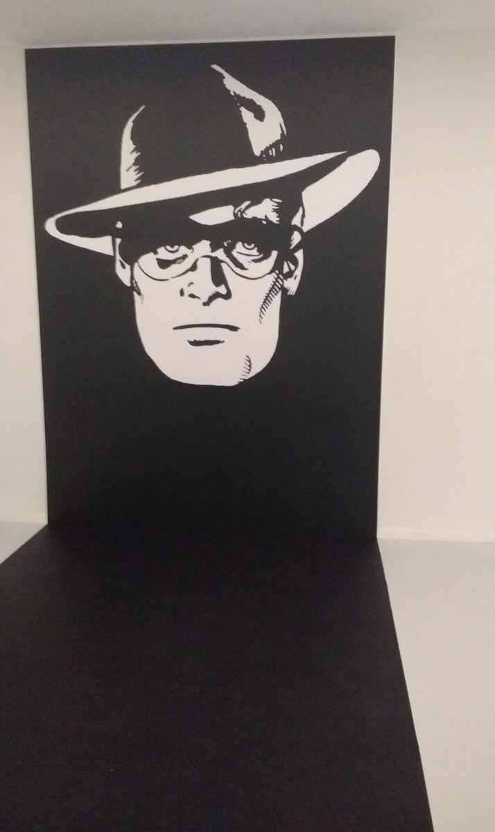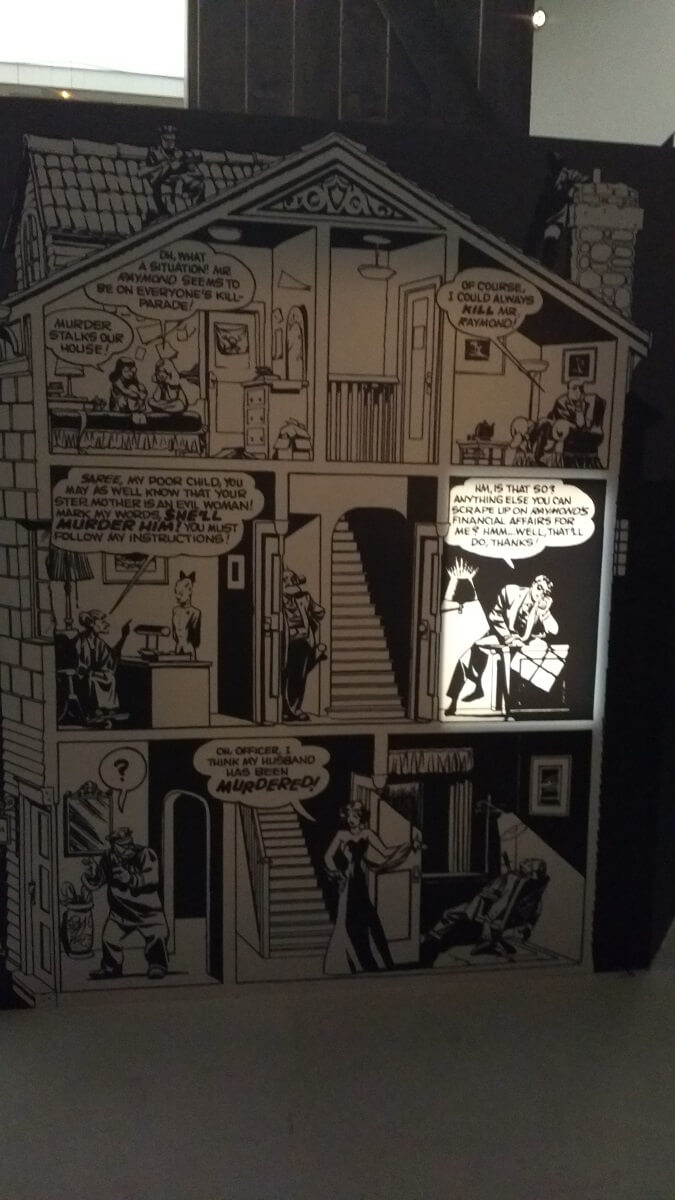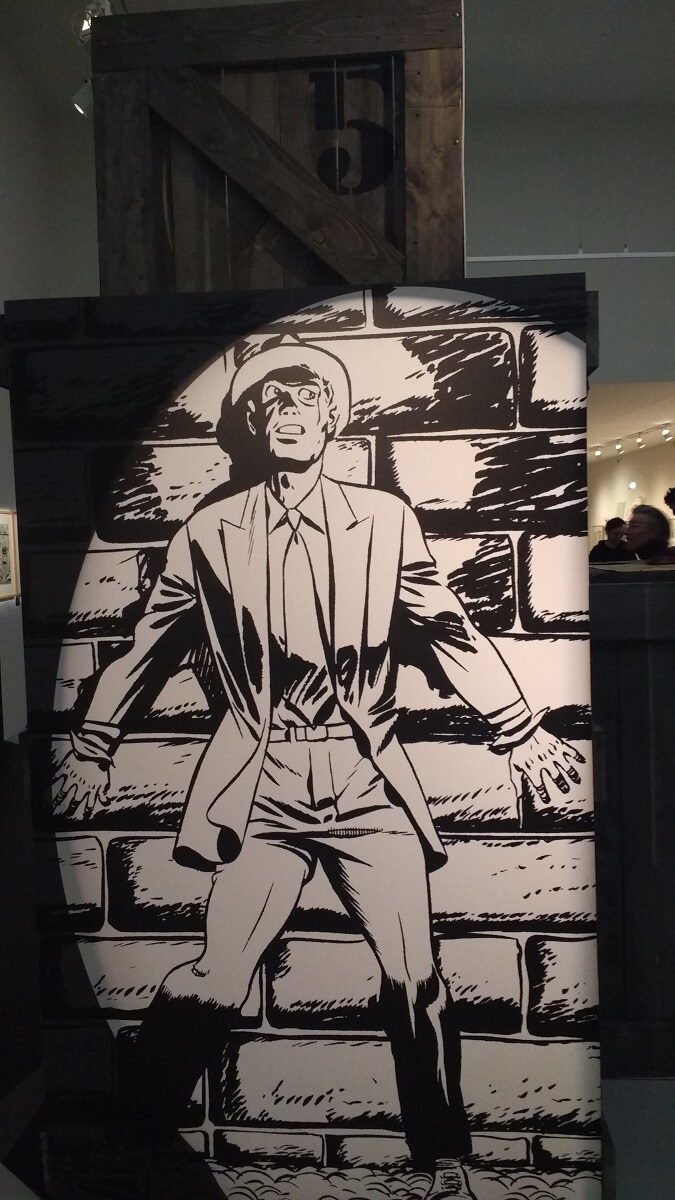 Ce qui frappe le visiteur lorsqu’il entre dans l’exposition Will Eisner, c’est la qualité et le soin apporté à la scénographie mise en scène par l’Atelier Lucie Lom. Il faut souligner que le commissaire d’exposition, Jean-Pierre Mercier est un des très grands spécialistes du monde du 9e art et qu’il a voulu mettre en lumière la magnifique œuvre du maître américain. Ainsi, des caisses énormes sont entreposées les unes sur les autres pour évoquer les buildings de Central City. Dessus ont été peintes de gigantesques illustrations du Spirit. Les planches originales couvrent les murs agrémentés d’ombres mais aussi les fameuses caisses en bois. Un scène de crime est reconstituée au début de la visite.