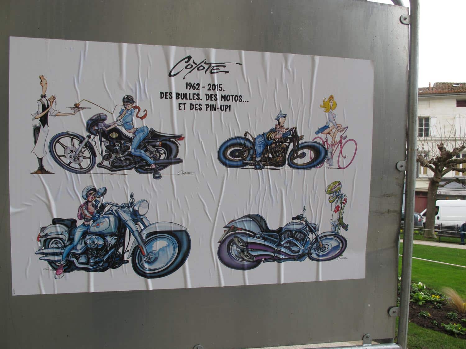 Cet été, Coyote nous quittait en laissant orphelin Litteul Kévin, le monde de la moto et le 9e art. Hommage à travers une exposition de ses dessins dans l’espace public : retrouvez une sélection de ses meilleures images sur une trentaine de panneaux électoraux implantés dans les rues et sur les places d’Angoulême.