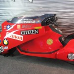 Après avoir relevé le cockpit, Kaneda s’assoit dans un fauteuil en cuir. Sa moto de 2 mètres de long, le fait voyager à 34 cm du sol !