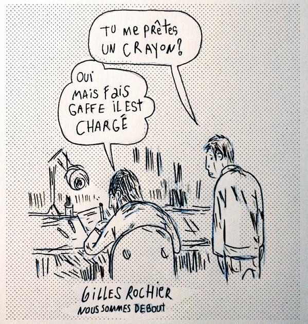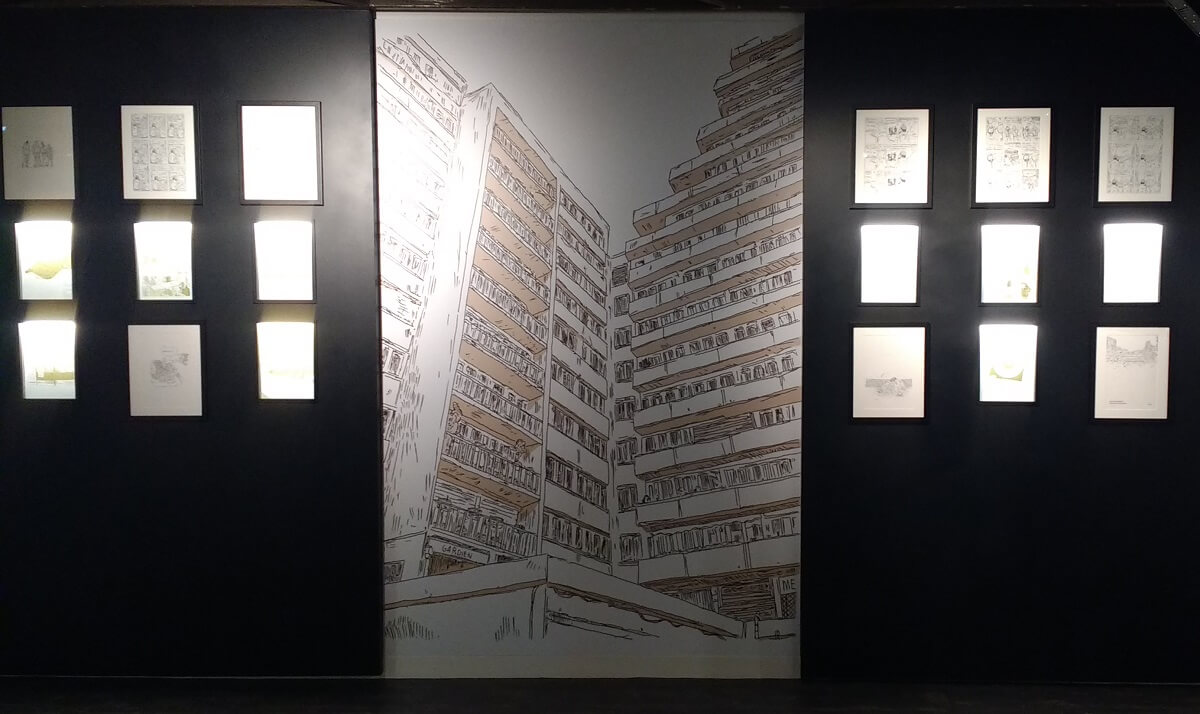 Des immeubles poussent dans la salle de l’Espace Franquin. Les planches sont accrochées mais pour une fois le festivalier peut lire presque toutes les histoires complètes. Gilles Rochier publie de courts récits – cela vient de sa culture du fanzinat – qui forment souvent un récit entier.