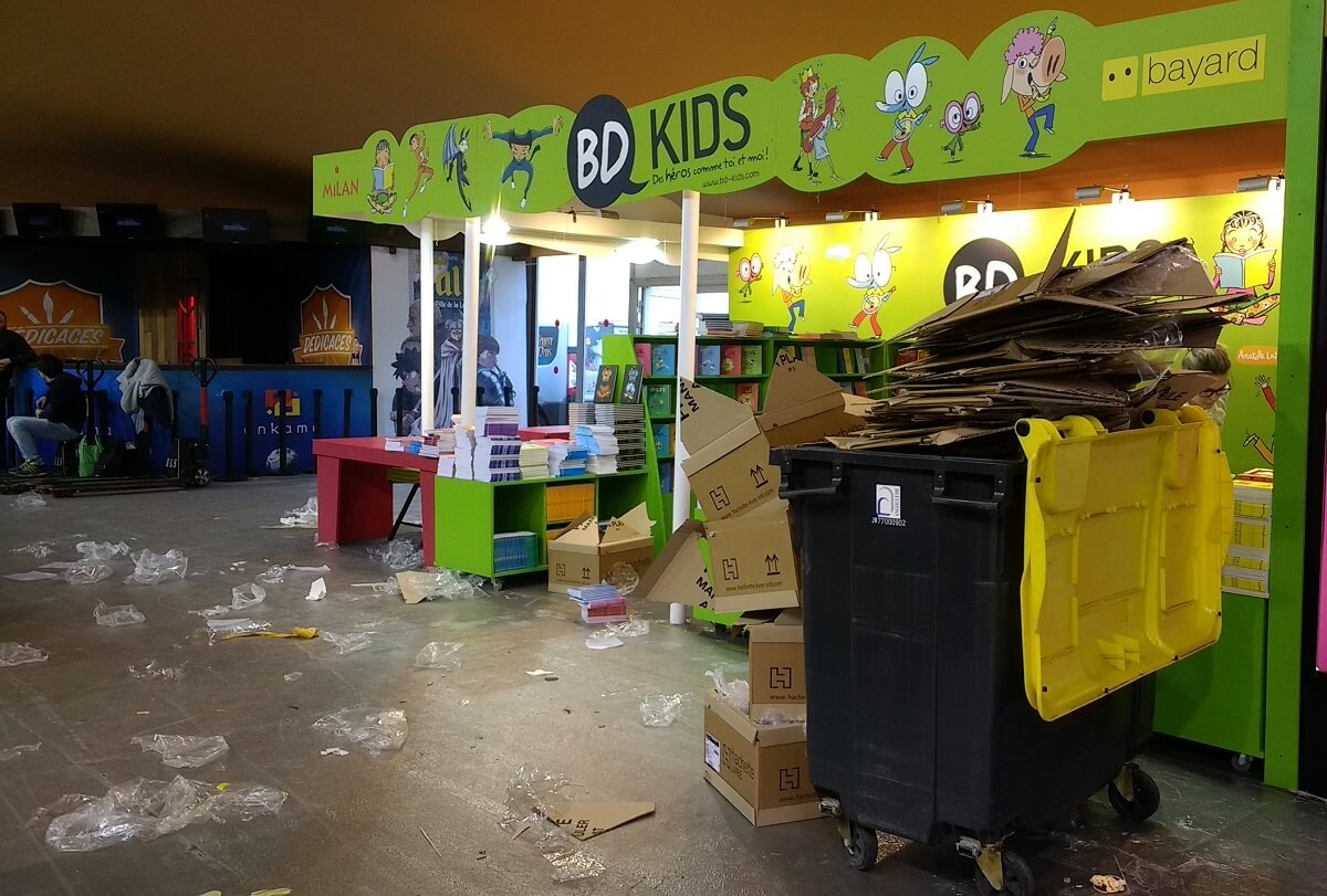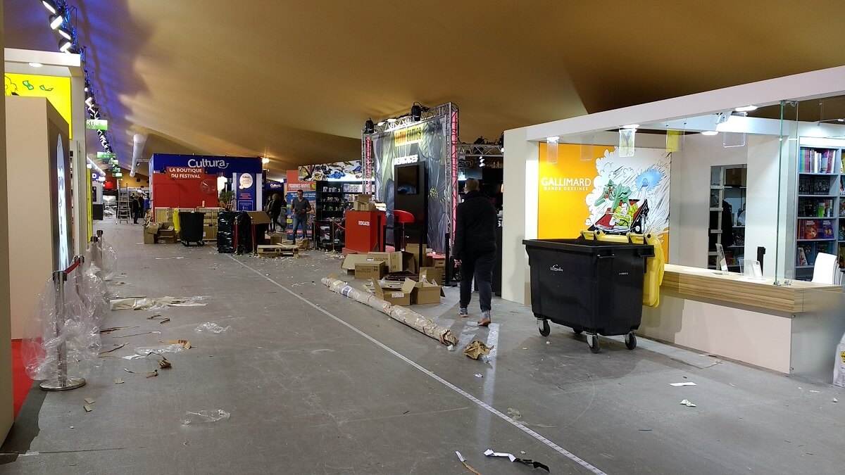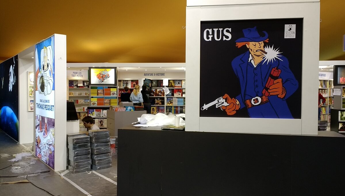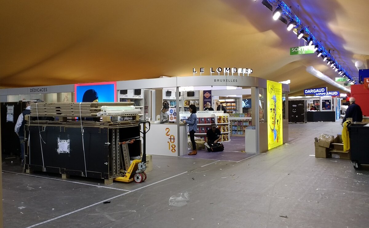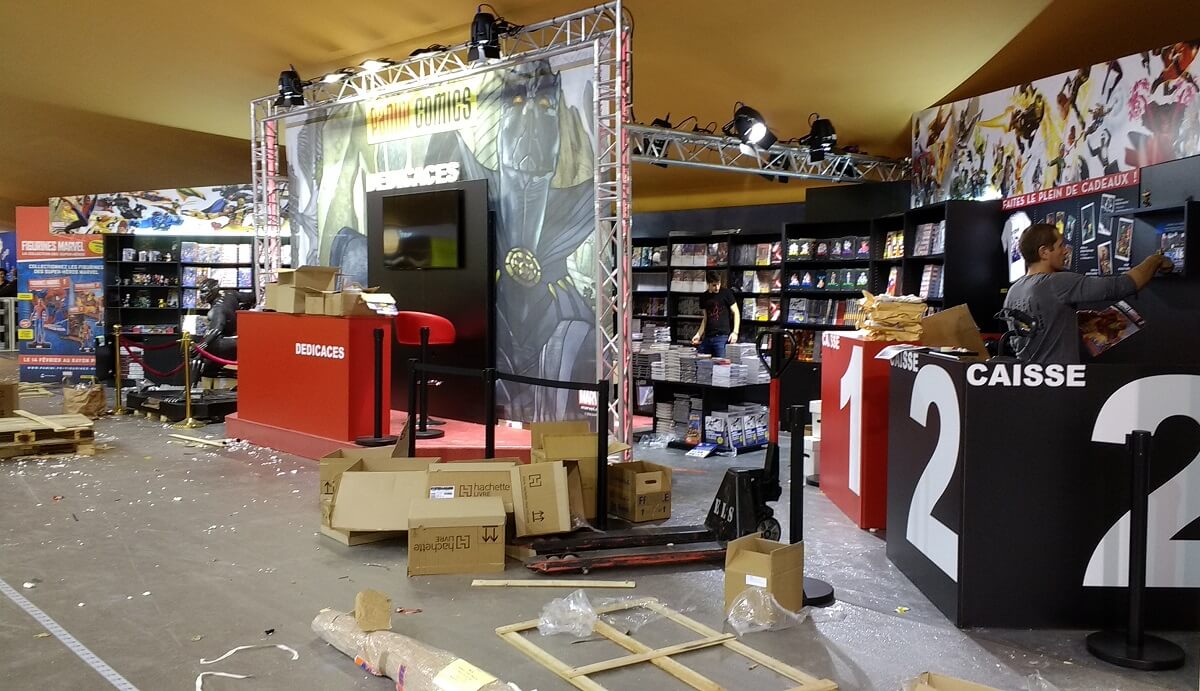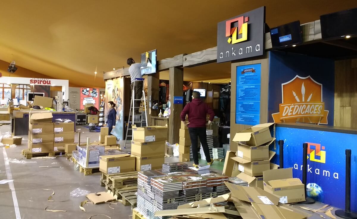 Le ballet des camions, transpalettes et monte-charge s’intensifie. Le personnel déballe les tonnes de bandes dessinées pour les installer dans les rayonnages, met en place les panneaux, les stickers de décoration ou note le nom des auteurs en dédicaces. Les moquettes sont encore protégées de bâches plastiques pour ne pas les salir.