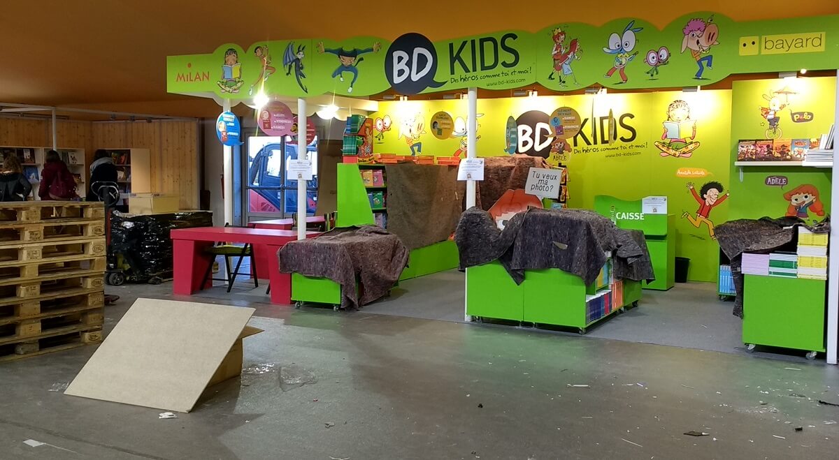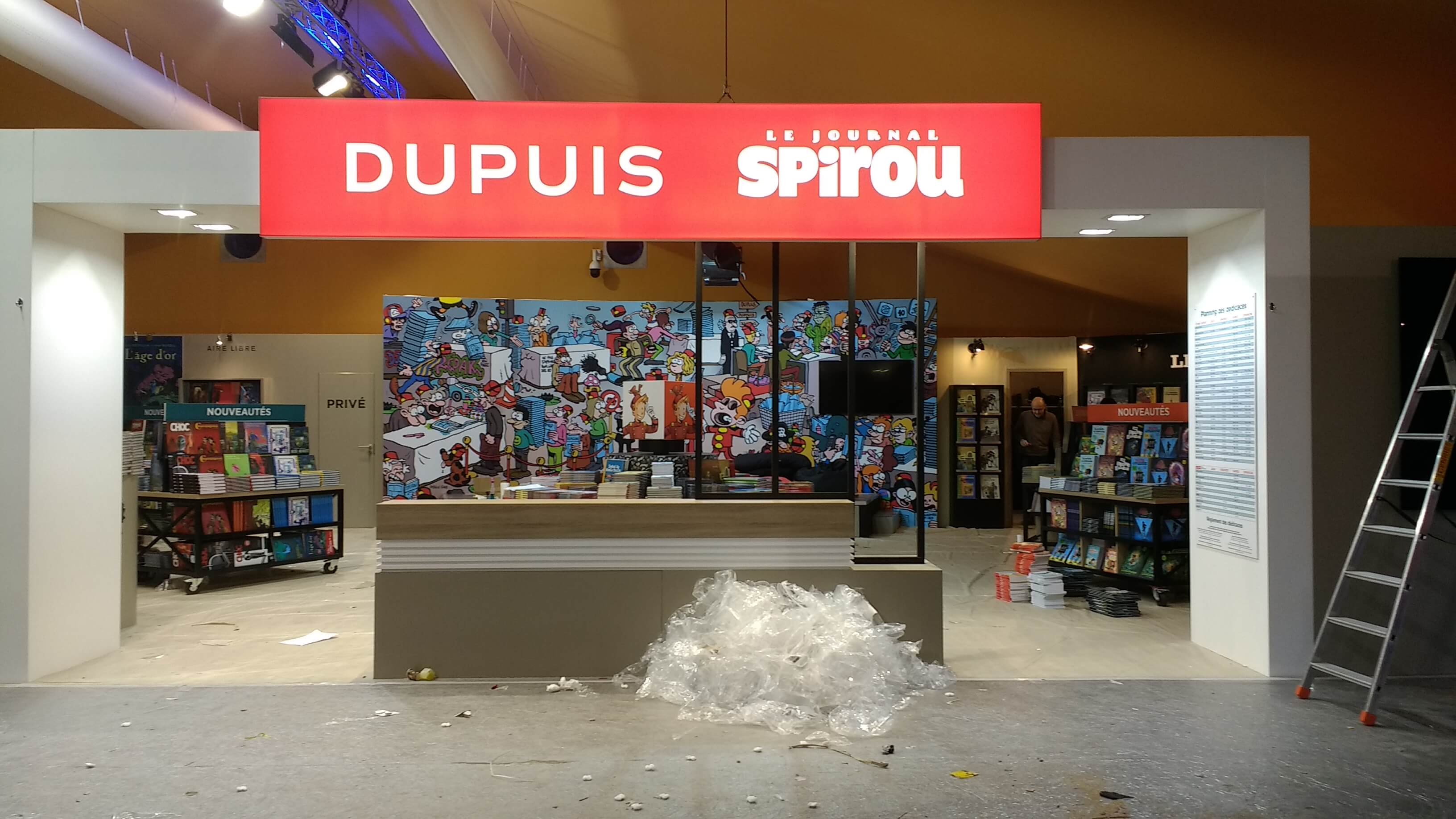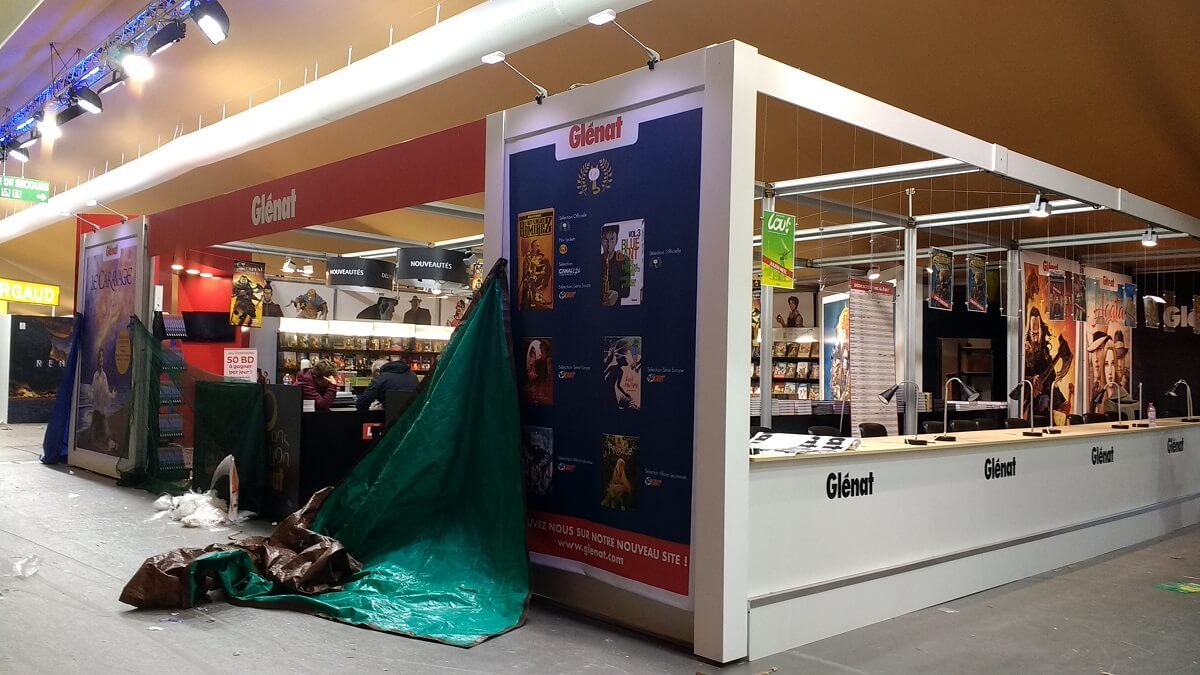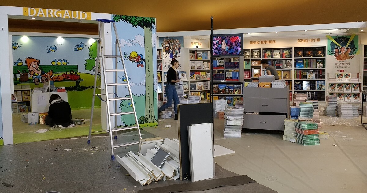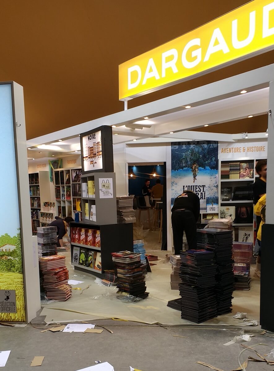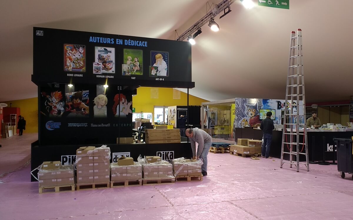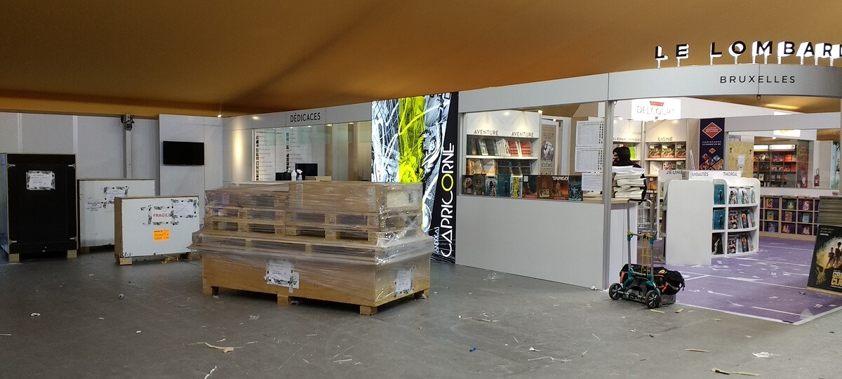 Le ballet des camions, transpalettes et monte-charge s’intensifie. Le personnel déballe les tonnes de bandes dessinées pour les installer dans les rayonnages, met en place les panneaux, les stickers de décoration ou note le nom des auteurs en dédicaces. Les moquettes sont encore protégées de bâches plastiques pour ne pas les salir. Tout ce petit monde s’active et risque de terminer tard dans la nuit.