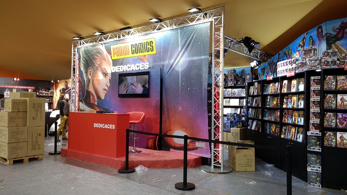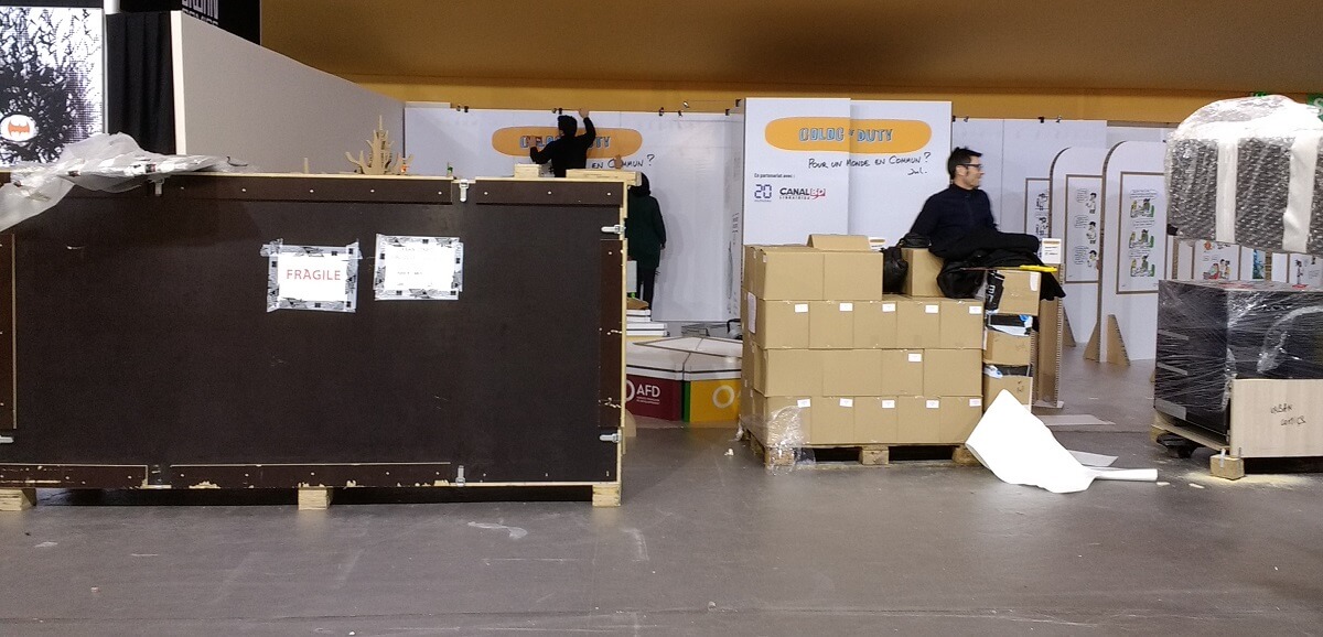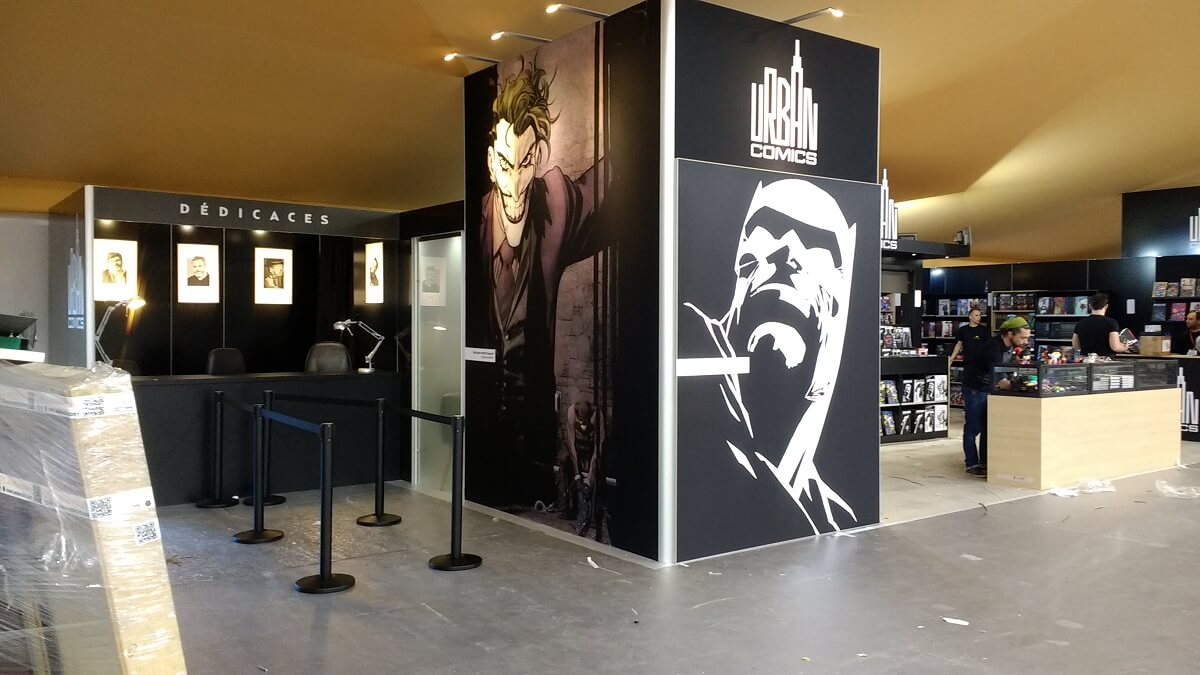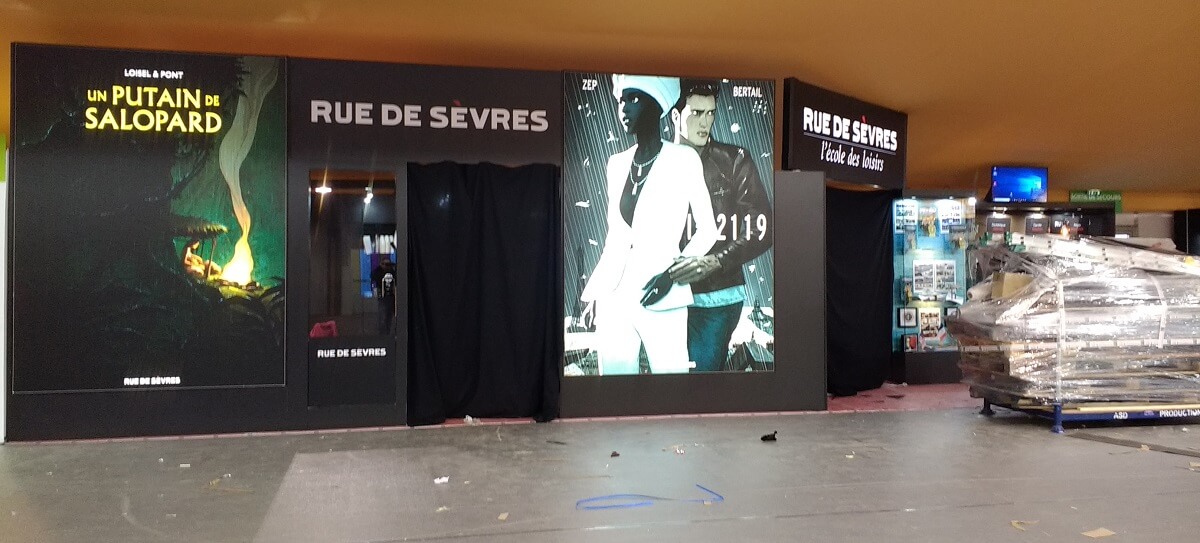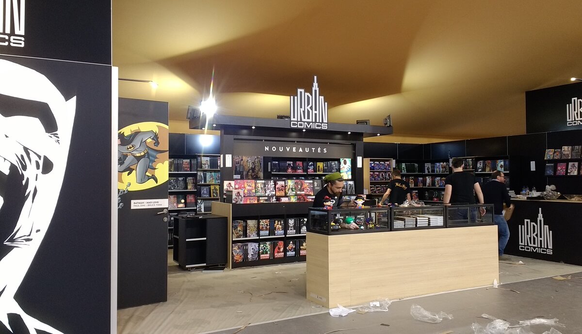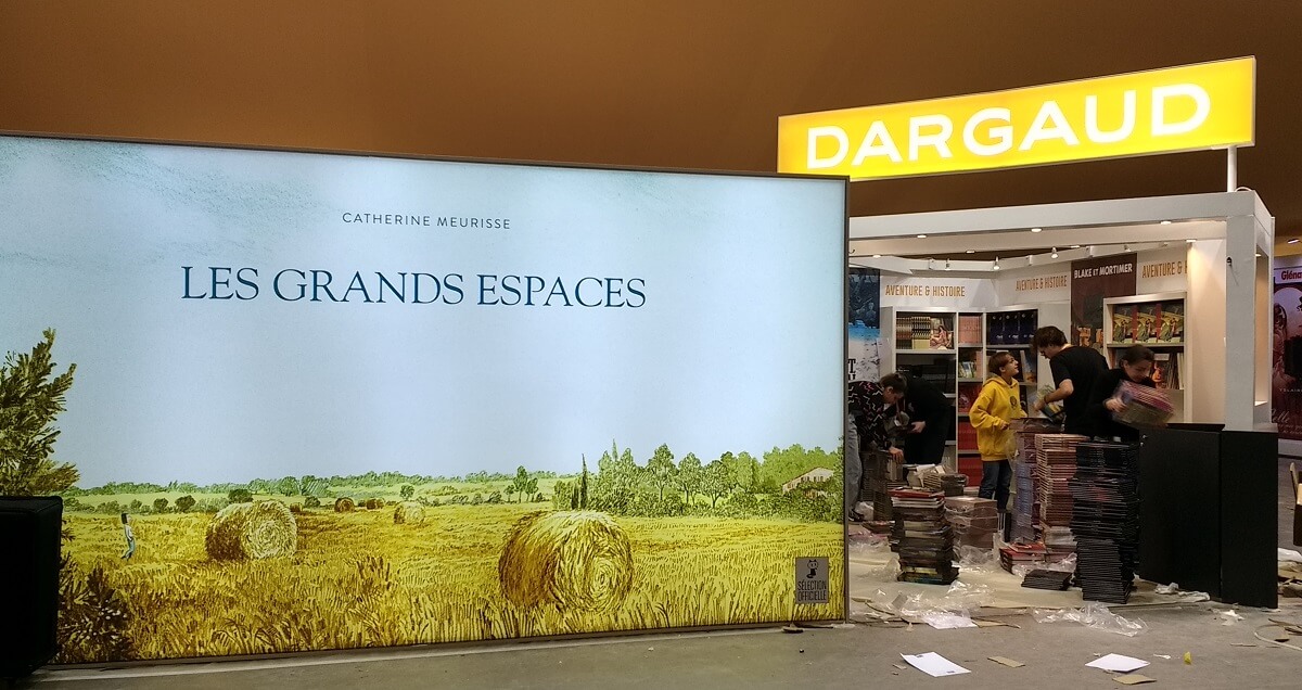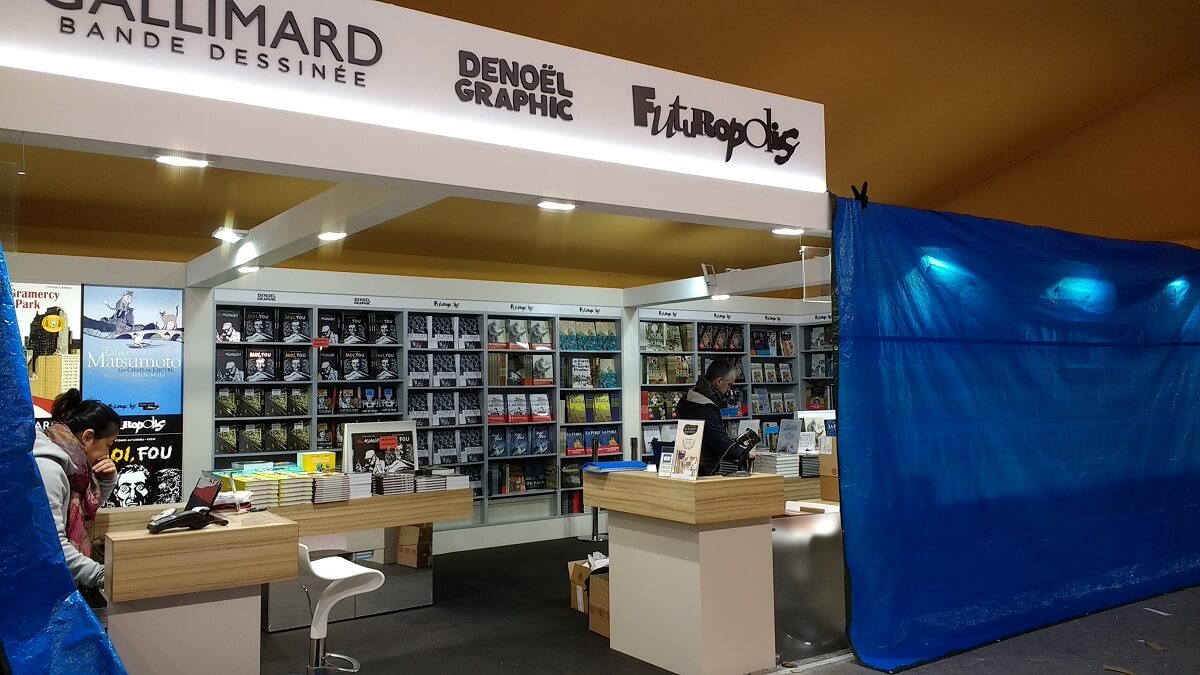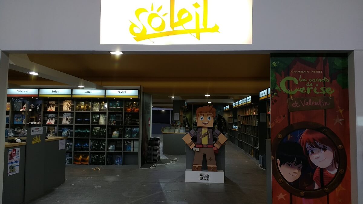 Le ballet des camions, transpalettes et monte-charge s’intensifie. Le personnel déballe les tonnes de bandes dessinées pour les installer dans les rayonnages, met en place les panneaux, les stickers de décoration ou note le nom des auteurs en dédicaces. Les moquettes sont encore protégées de bâches plastiques pour ne pas les salir. Tout ce petit monde s’active et risque de terminer tard dans la nuit.