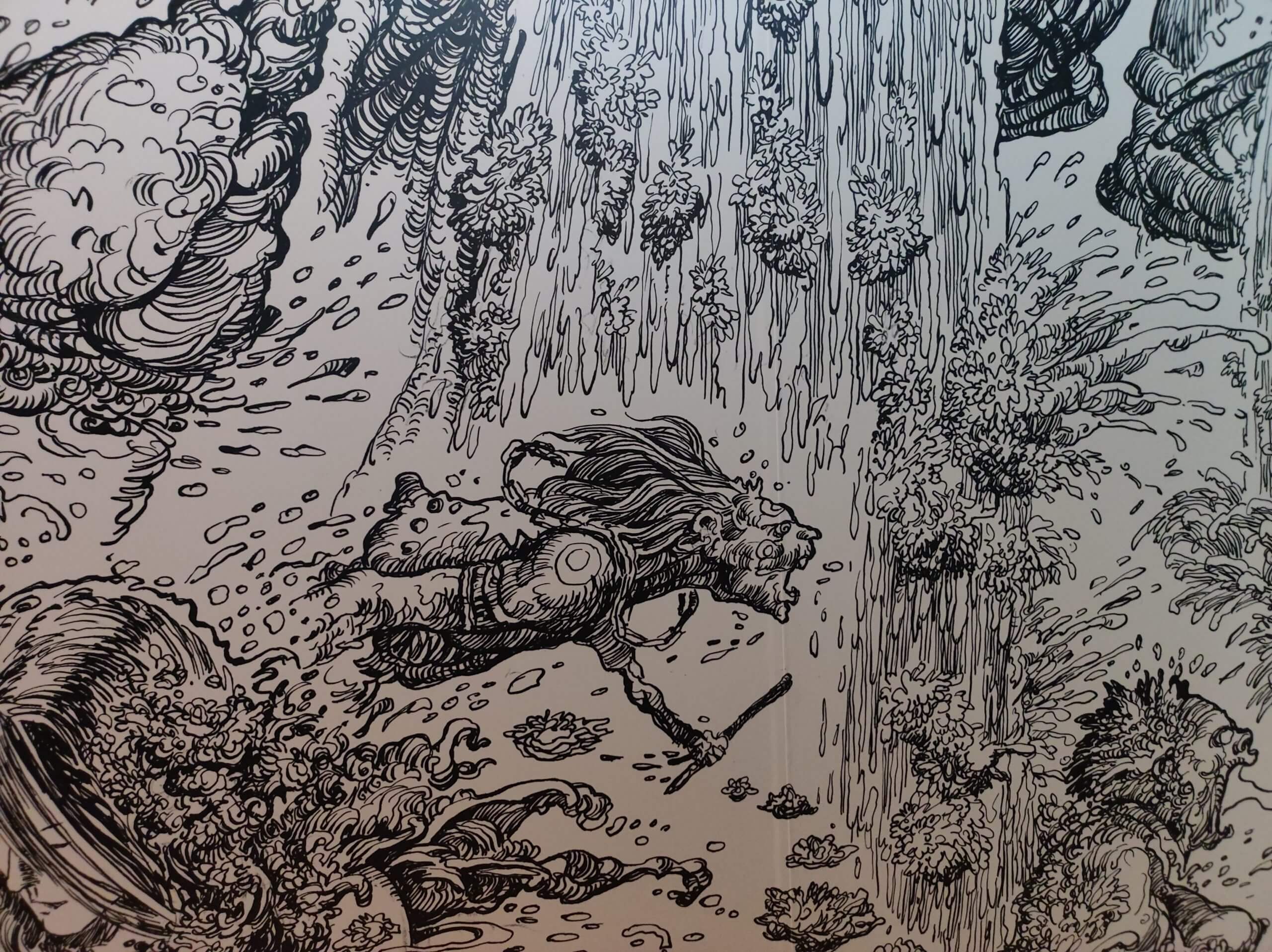 Et l’on peut dire qu’en visitant cette exposition rétrospective, c’est qu’on en prend plein les yeux. Sans être un connaisseur de l’auteur de Loane Slone, on peut largement apprécier son trait merveilleux. Nul besoin non plus de bien connaître la science-fiction pour être cueilli par la beauté des noirs et blancs et des illustrations couleurs. Les détails et les hachures fascinent les festivaliers.