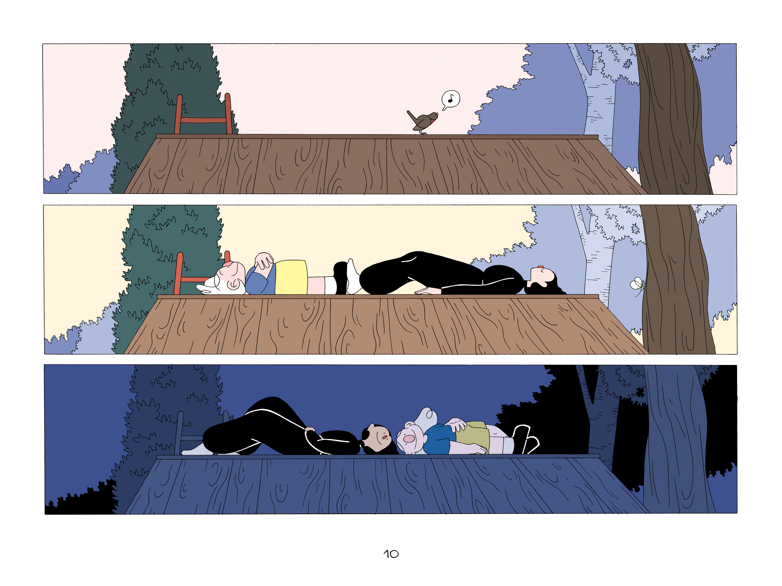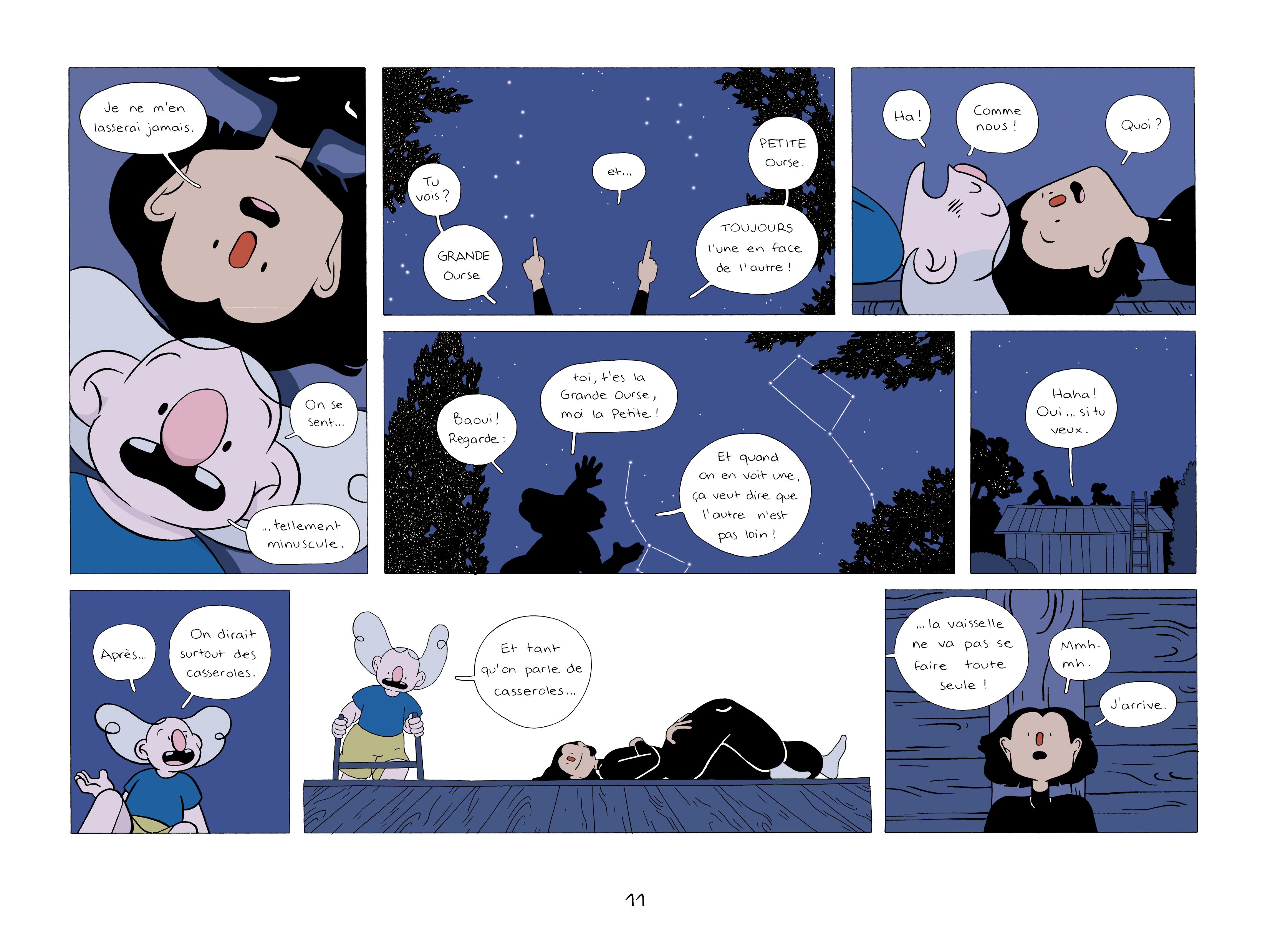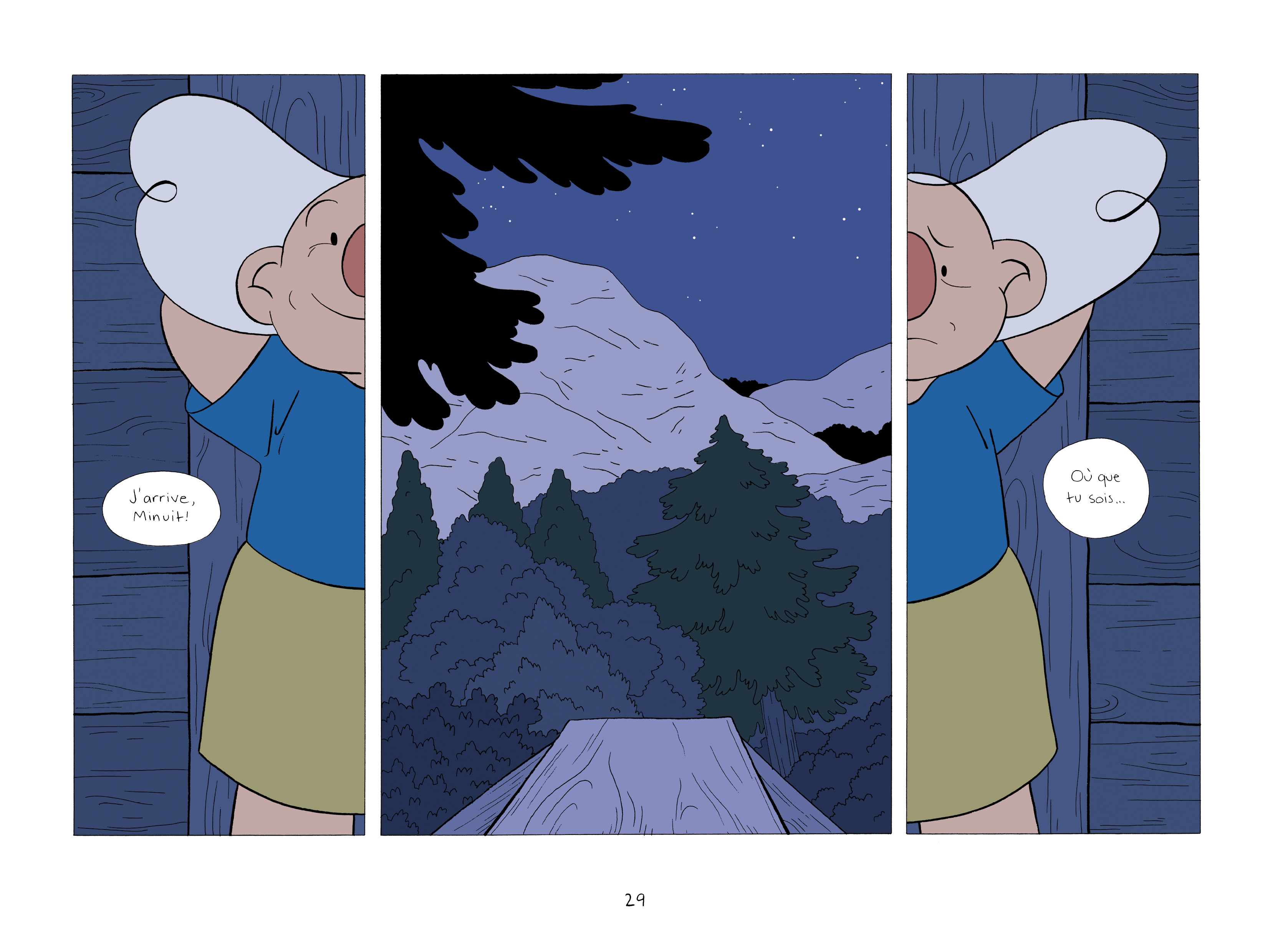Mais, j’ai quand même un peu mis de l’espace entre certaines scènes. J’ai fait des grandes planches un peu plus contemplatives pour dire : “là on se calme, c’est la nuit, on dort”.
