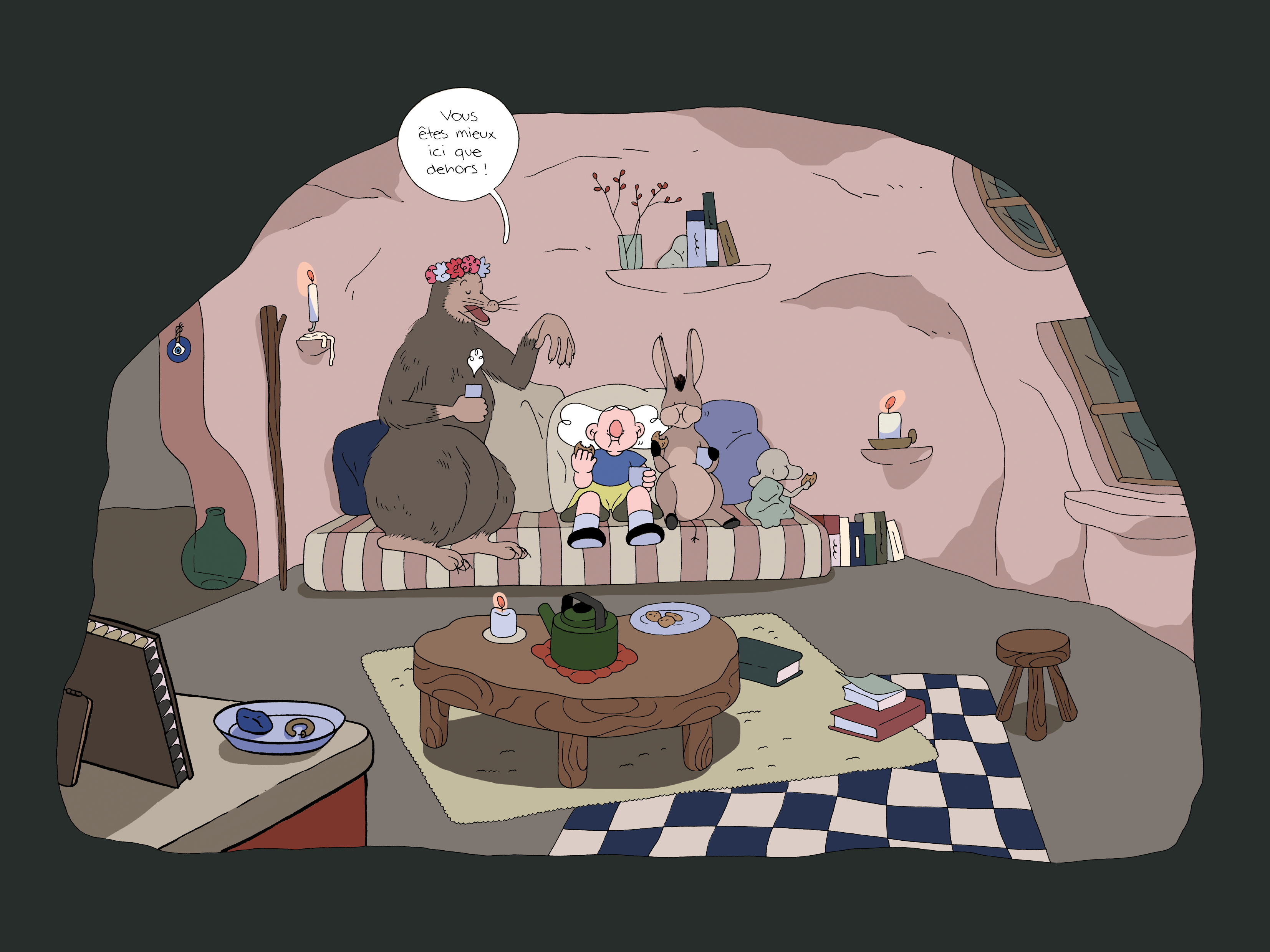 Et puis, au milieu de ça, des petites cabanes, un petit truc un peu cosy, avec chacun la sienne. C’est sûrement les personnages qui les ont construites. Personne ne les a aidés. Il faut aussi qu’ils se débrouillent.