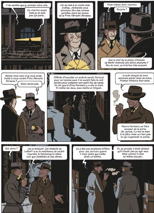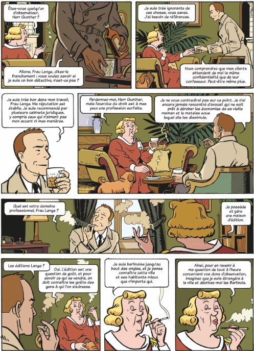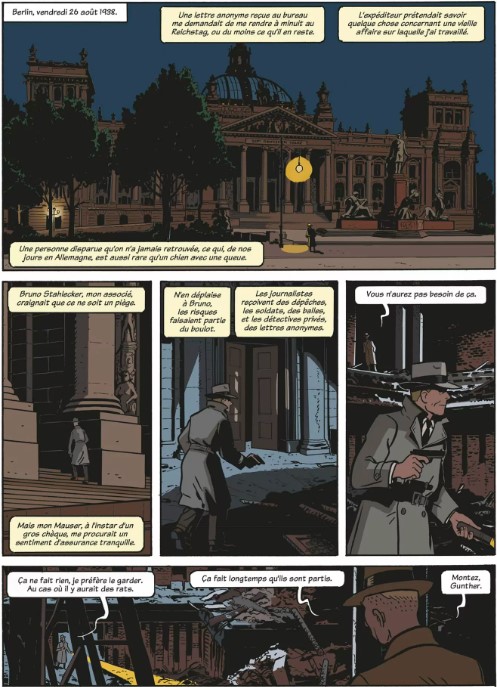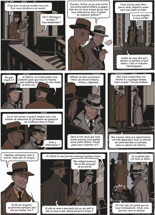 Sinon, c’est vraiment du Philippe Kerr dans le texte. On est restés fidèles à l’intrigue, même si on a juste supprimé des scènes qui étaient superflues. Comme quand Philip Kerr écrit des petites scènes pour se faire plaisir ou met en place des personnages. Ce sont des choses dont on n’a pas forcément besoin dans les bandes dessinées, parce qu’on est quand même limités par la place.