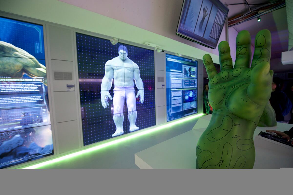 Puis arrive le Laboratoire de Bruce Banner, le scientifique qui se transforme en Hulk, créature invulnérable. Un mur interactif ou encore la reproduction grandeur nature de ses immenses mains vertes, que le visiteur peut comparer aux siennes, sont à découvrir.