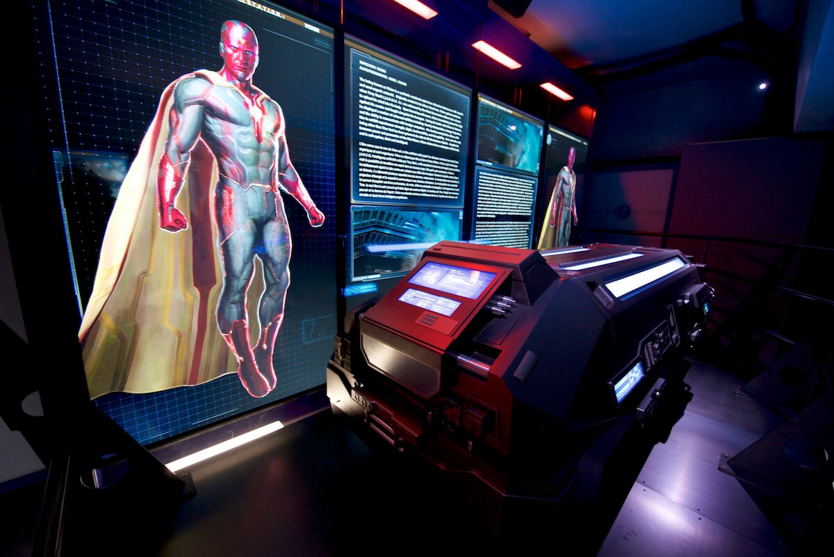 Black Widow et Hawkeye se dévoilent ensuite par des écrans munis d’hologrammes – réalité augmentée – avec leurs armes et notamment les bracelets électrostatiques de Natasha et l’arc de Clint. Sam Wilson – Le faucon – déploie ses ailes et Ant-Man met son casque devant le visiteur.