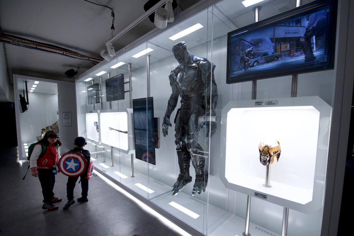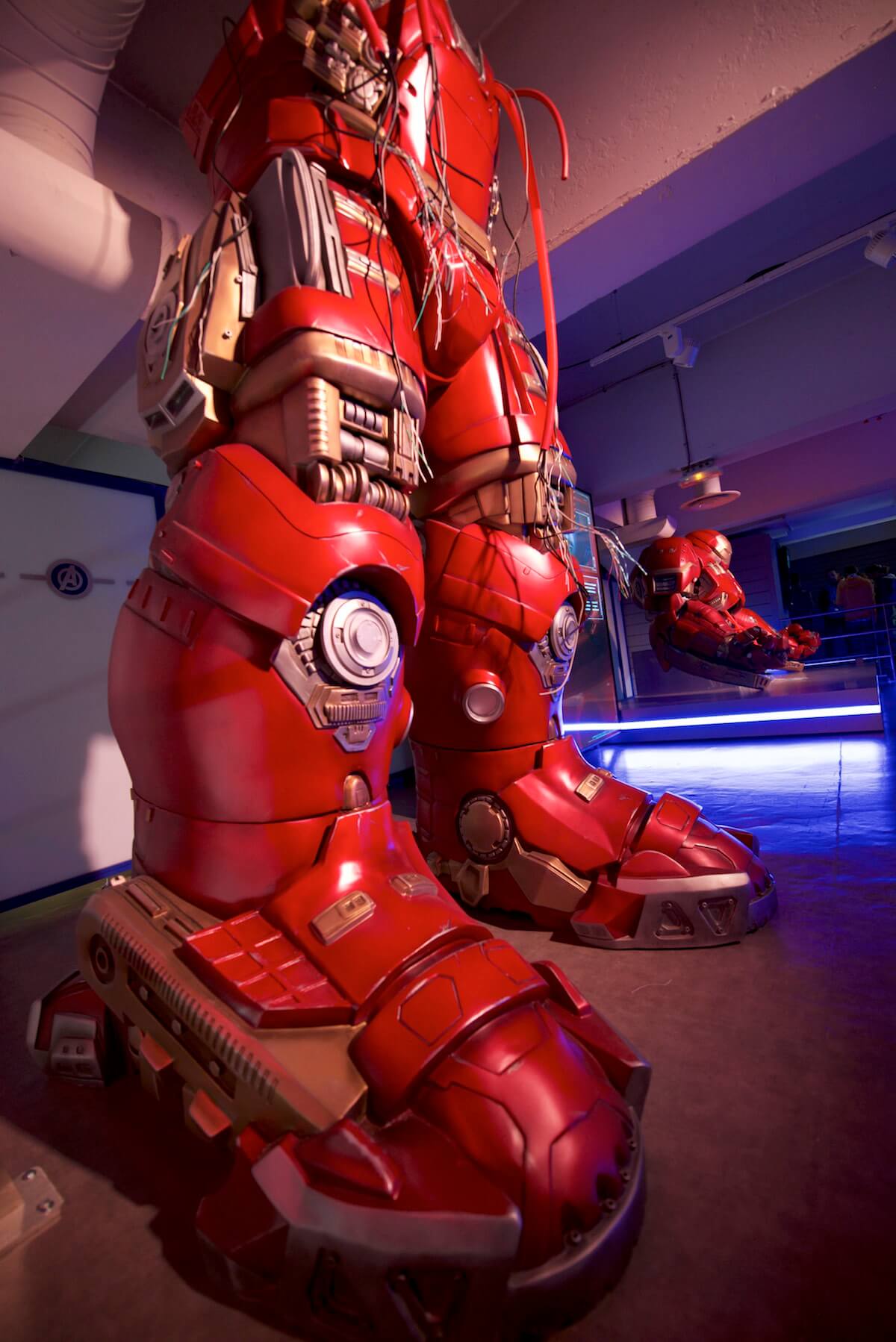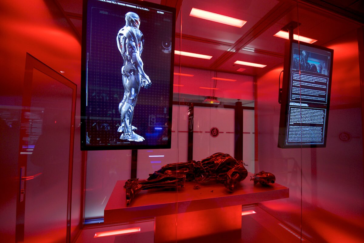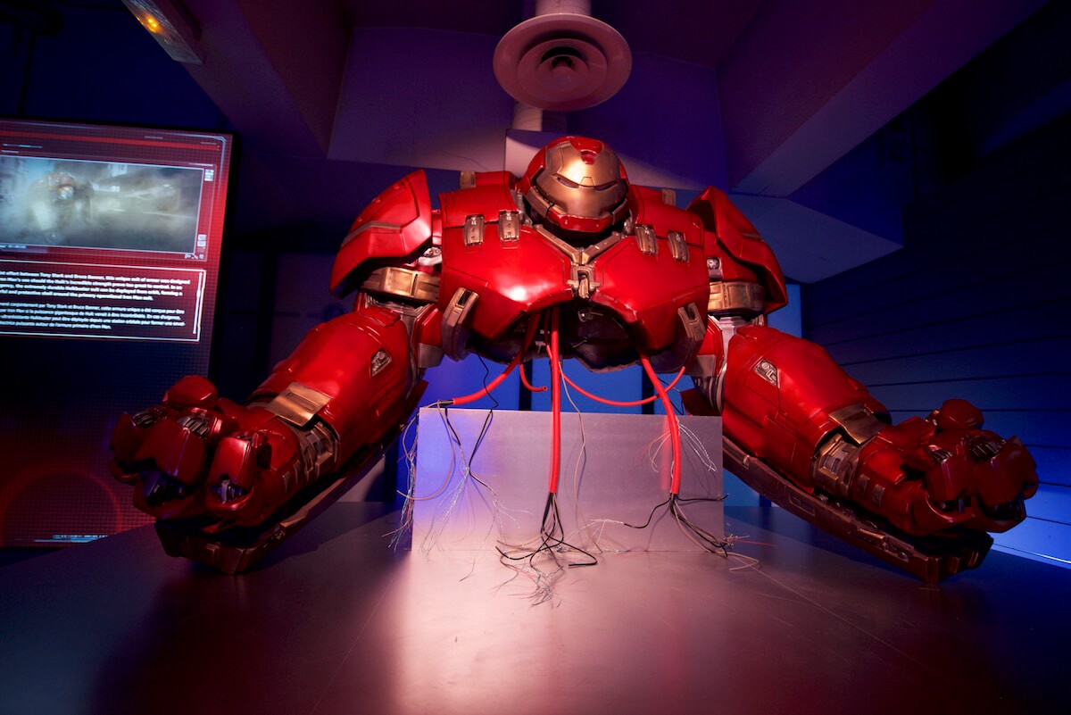 Enfin, ils découvrent L’atelier d’ingénierie d’Iron Man, la dernière salle de l’exposition. Trône en son centre, les deux équipements grandeur nature de Tony Stark et de James Rhodes. Mais aussi une armure MK43 en cours d’assemblage pour Hulk (Hulkbuster) et dans un coin le gisant d’un Ultron détruit.