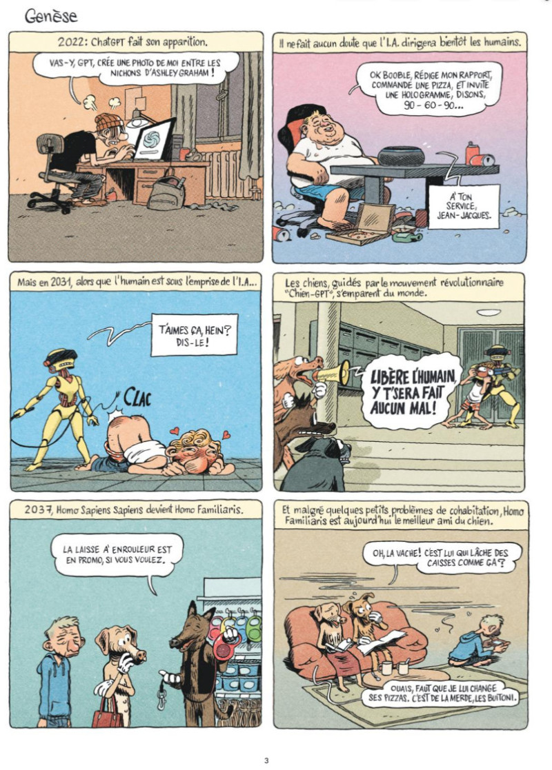 Résumé de l’éditeur : Un album sociétal où les chiens prennent la place des humains, et les humains finissent par adopter le comportement des chiens. Les hommes courent lentement à leur perte et le monde s’effondre, laissant les IA comme têtes dirigeantes. Et si les chiens décidaient de prendre le pouvoir ? Face à l’échec humain, les chiens décident de reprendre les rennes pour rétablir l’ordre et la paix. Mais si les quadrupèdes gagnent en responsabilité, les bipèdes quant à eux se voient relégués au rang d’animaux de compagnie. Tenus en laisse, forcés de se reproduire pour entretenir leur lignée, incapables de rester plus d’une heure seuls dans un appartement… Les humains occupent alors la place des chiens. Avec cette inversion de génie, Olivier Lhote (comportementaliste canin de profession) et Guillaume Guerse portent un regard plein d’humour sur la relation que nous entretenons avec nos animaux de compagnie, tout en dénonçant certains travers de notre société.