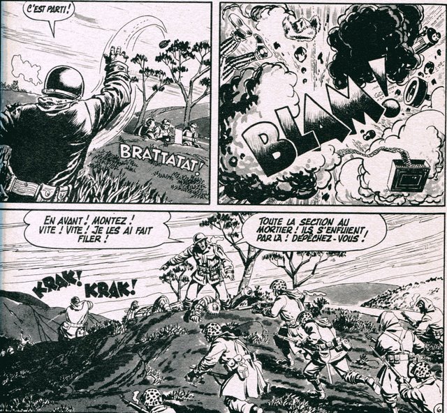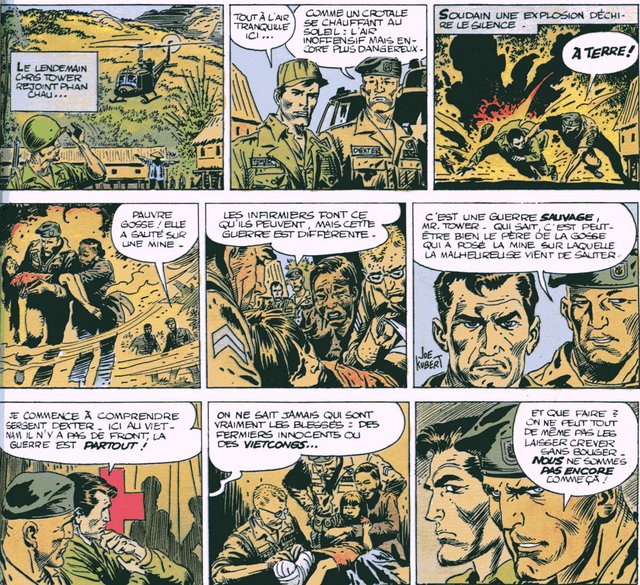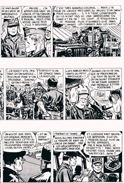 Pour le Vietnam, deux tendances s’imposent. Milton Caniff encore une fois, avec son héros le colonel Steve Canyon dans un récit (intitulé sobrement « Vietnam ») – là aussi avec cette technique d’histoires courtes en noir et blanc décidément très prisée outre-Atlantique – très documenté et s’essayant à une certaine distance. Et puis le « Forces spéciales » de Joe Kubert nettement plus violent et parfaitement partial (publié d’abord dans la presse sous le nom d’ « Histoire des Bérets verts ».